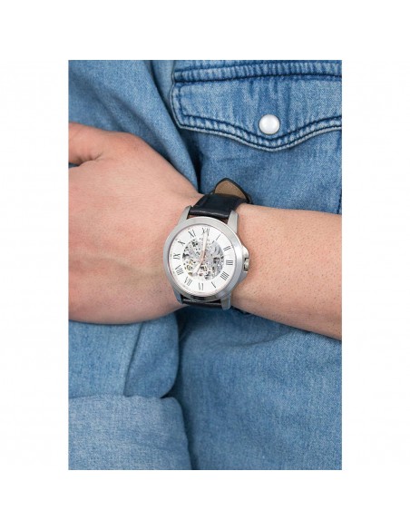 Ceas de mana barbati Fossil Automatic Grant Skeleton ME3101, este un ceas fashion automatic 8N24-N-Me de 45mm diametru cu curea de piele neagra si 50WR. Este un ceas analog cu geam cristal mineral.