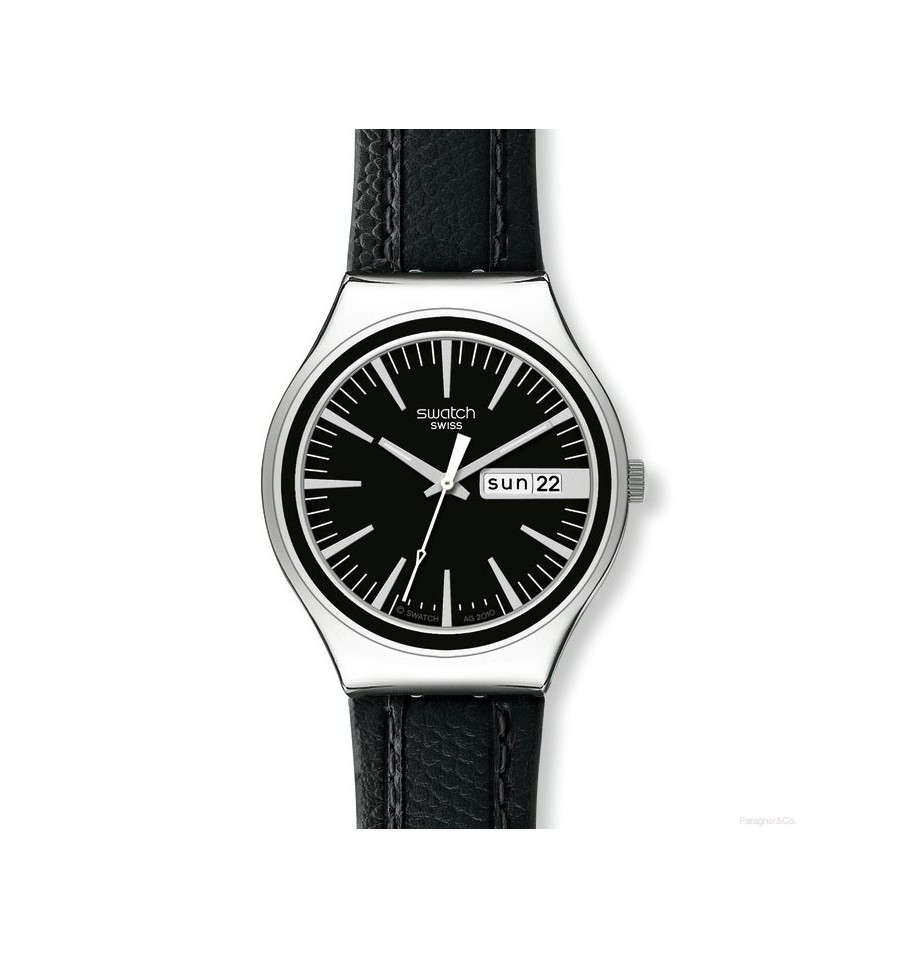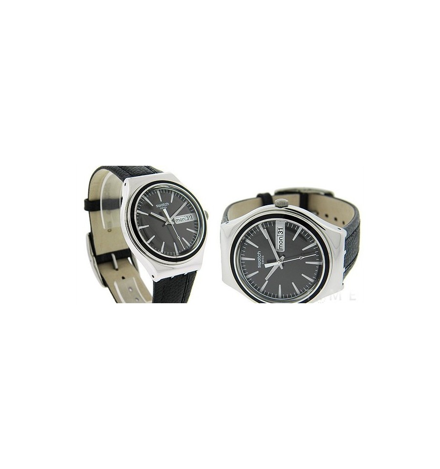 Acesta este un ceas de mana barbatesc fabricat de catre renumita firma elvetiana Swatch. Face parte din seria Irony Big. Carcasa este din otel inoxidabil. Bratara este din piele neagra. Cadranul negru este rotund. Afiseaza ziua si data. Rezista la apa. Este elegant si sobru.
