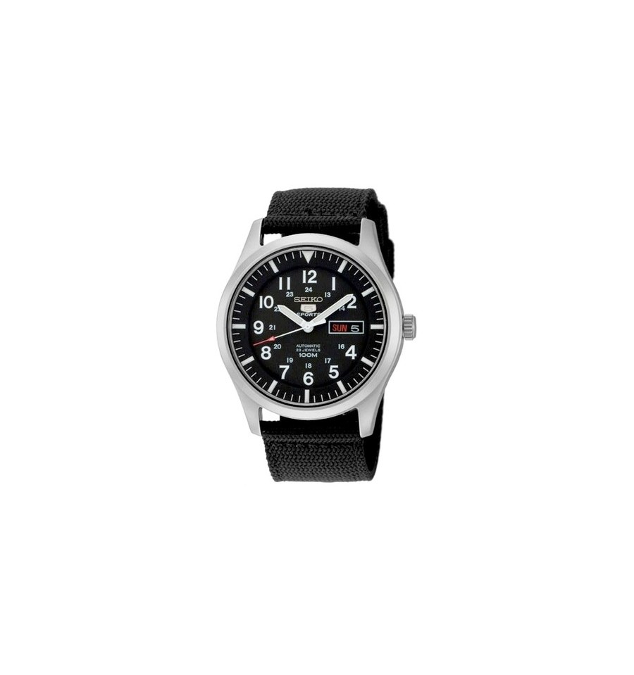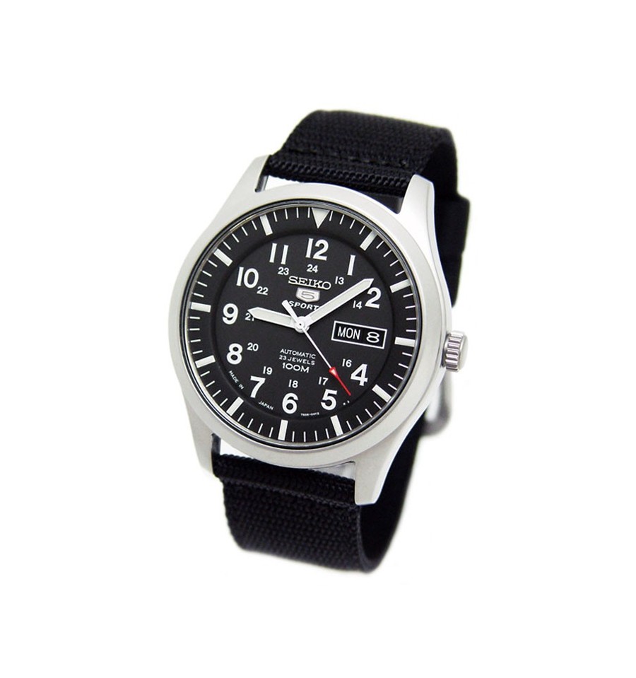 Acest ceas de mana barbatesc, SNZG15, produs de renumitul Seiko, are carcasa din otel inoxidabil alb, curea din nylon de culoare nearga, inchisa prin catarama, cadranul negru, iar geamul din cristal mineral hardlex. Seiko 5 SNZG15 are mecasnimul automatic cu 23 Rubine.