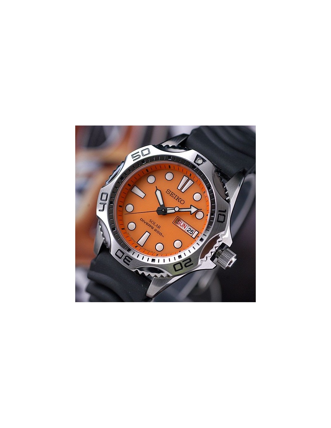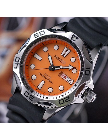 Acest ceas de mana barbatesc, Divers SNE109, produs de renumitul producator Seiko, are carcasa din otel inoxidabil alb, curea din cauciuc rezistent pentru scufundari, bezelul rotativ unidirectional, cadranul portocaliu si luminos, iar geamul din cristal mineral rezistent la zgarieturi. Ceasul are mecanismul pe baza de quartz si nu necesita baterie, convertestind orice sursa de lumina fie naturala, fie artificiala, in energie utilizabila.