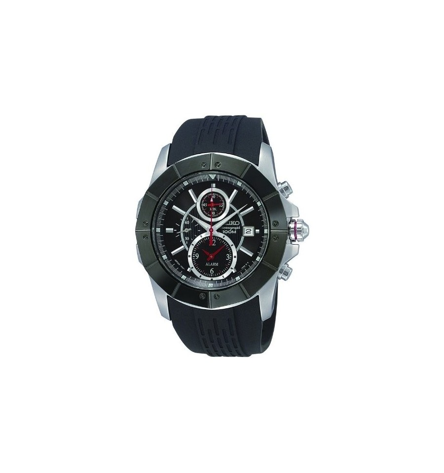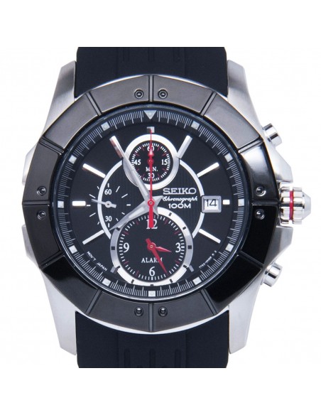 Acest ceas de mana barbatesc, Chronograph SNAC99P1, produs de renumitul producator japonez Seiko, are carcasa din otel inoxidabil in doua nuante, cadranul negru, geamul din cristal mineral hardlex, curea din cauciuc, inchisa prin catarama. Seiko SNAC99P1 este dotat cu functie cronograf, calendar si alarma. Mecanismul ceasului este pe baza de quartz.