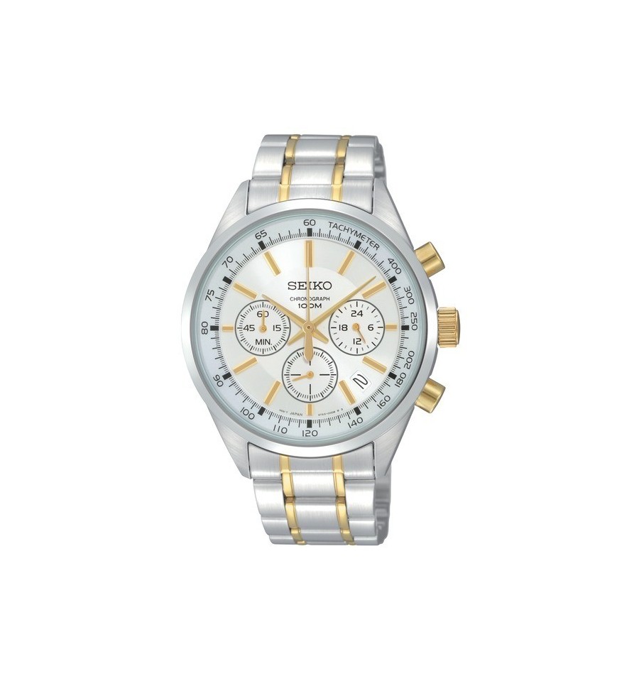 Acest ceas de mana barbatesc, Chronograph SSB043, produs de renumitul productor japonez Seiko, are carcasa si bratara din otel inoxidabil in doua nuante, cadranul albsi auriu, geamul din cristal mineral hardlex, iar sistemul de inchidere este de tip deployant. Seiko SSB043 este dotat cu functie cronograf, calendar si tahimetru. Mecanismul ceasului este pe baza de quartz.