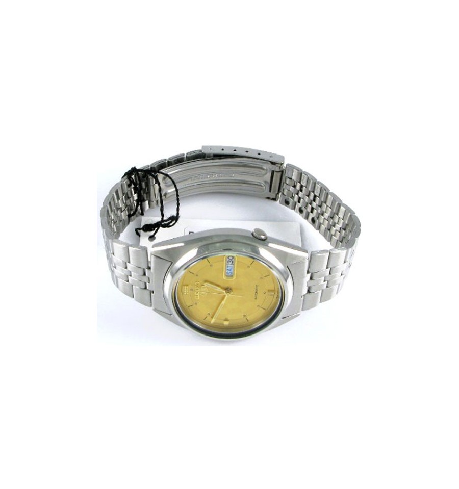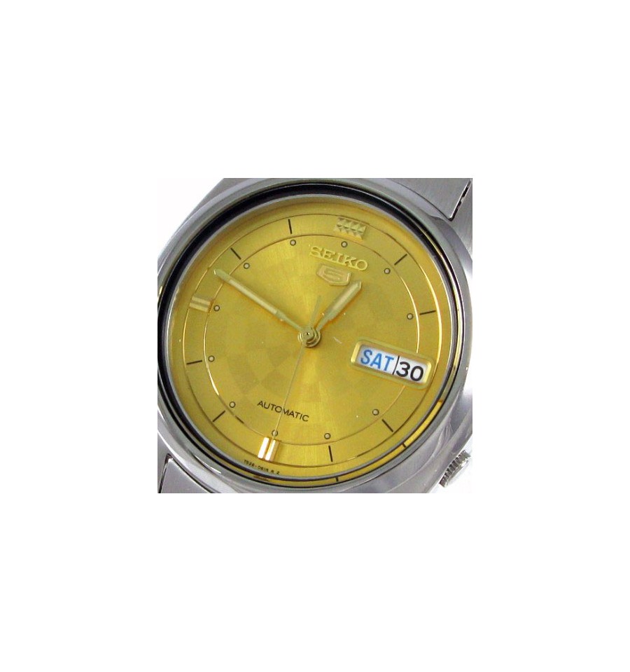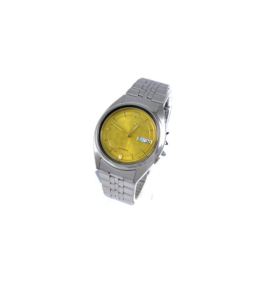 Acest ceas de mana barbatesc de la vestita firma japoneza SEIKO din seria Seiko 5 automatic model SNXV13 cu mecanism 7S26 cu 21 Jewels- rubine, rezistent la apa 30m, arata data si ziua in engleza sau franceza, carcasa si bratara sunt din otel inox , catarama cu buton pentru deschidere prin apasare, geamul din cristal Hardlex rezistent la zgarieturi, limbile sunt luminiscente, cifrele sunt puncte luminiscente, spatele infiletabil, grosimea carcasei 12mm, diametrul 38mm, cadran auriu, produsul vine ambalat in cutie, cu manual de instructiuni, garantie.