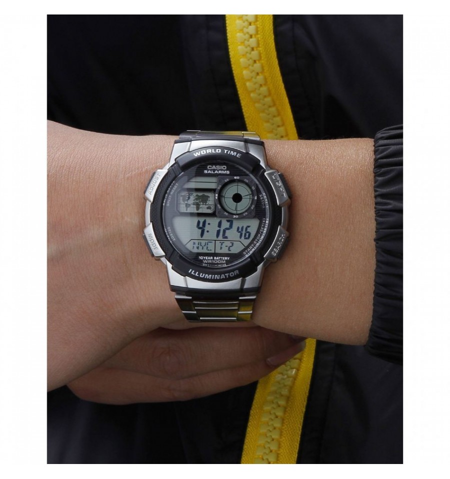 Aceast ceas de mana barbatesc, AE-1000WD-1A, produs de renumitul Casio, are carcasa si bratara din otel inoxdibail argintiu, cadranul cu afisaj digital de inalta densitate, iar geamul din cristal mineral rezistent la zgaireturi. Ceasul este dotat cu 5 alarme, cronometru, calendar automata, format 12/24 h, buton de activare sau dezactivare sunet si afiseaza timpul pentru 31 zone orare, precum si ora de vara/iarna.