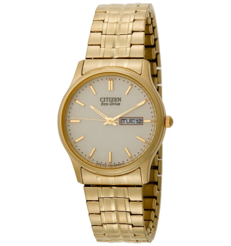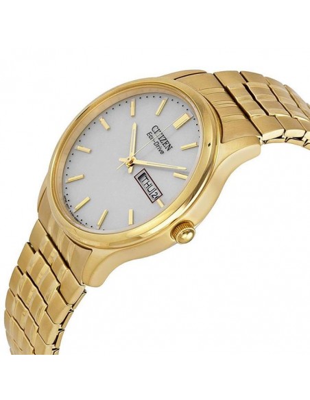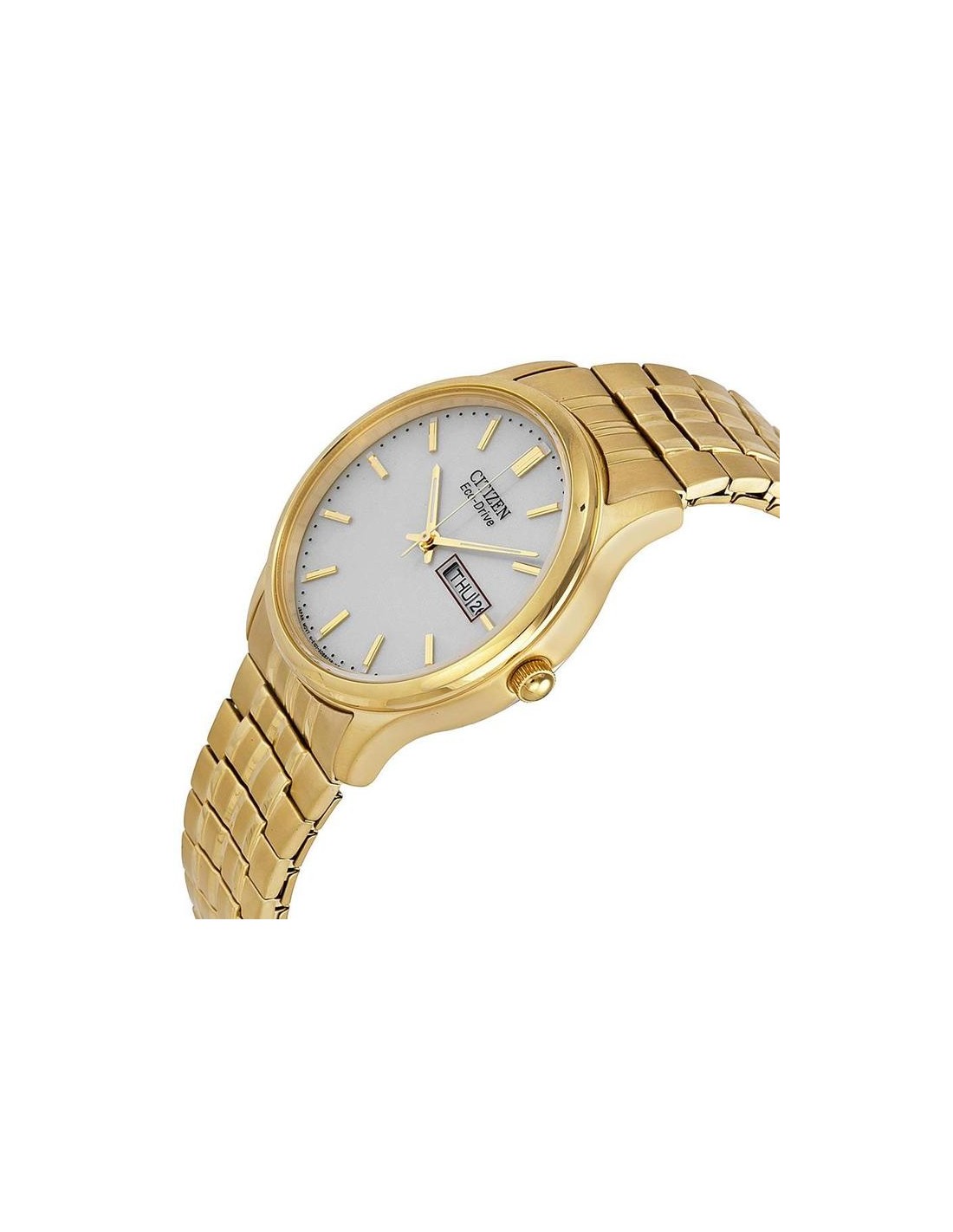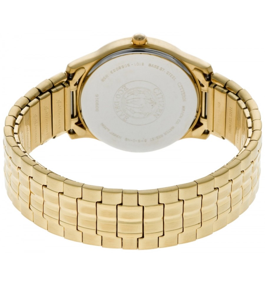 Acest ceas de mana barbatesc face parte din colectia Flexible Band, ceea ce inseamna ca bratara din otel inoxidabil auriu este felxibilia si nu are nevoie de incuitoare. Carcasa este din otel inoxidanil auriu, cadranul alb, iar geamul din cristal mineral. Ceasul converteste orice sursa de lumina fie naturala, fie artificiala, in energie utilizabila prin tehnologia Eco-Drive, are o rezerva de energie de 180 de zile, functie economisire energie si functie de avertizare energie redusa:7 zile.