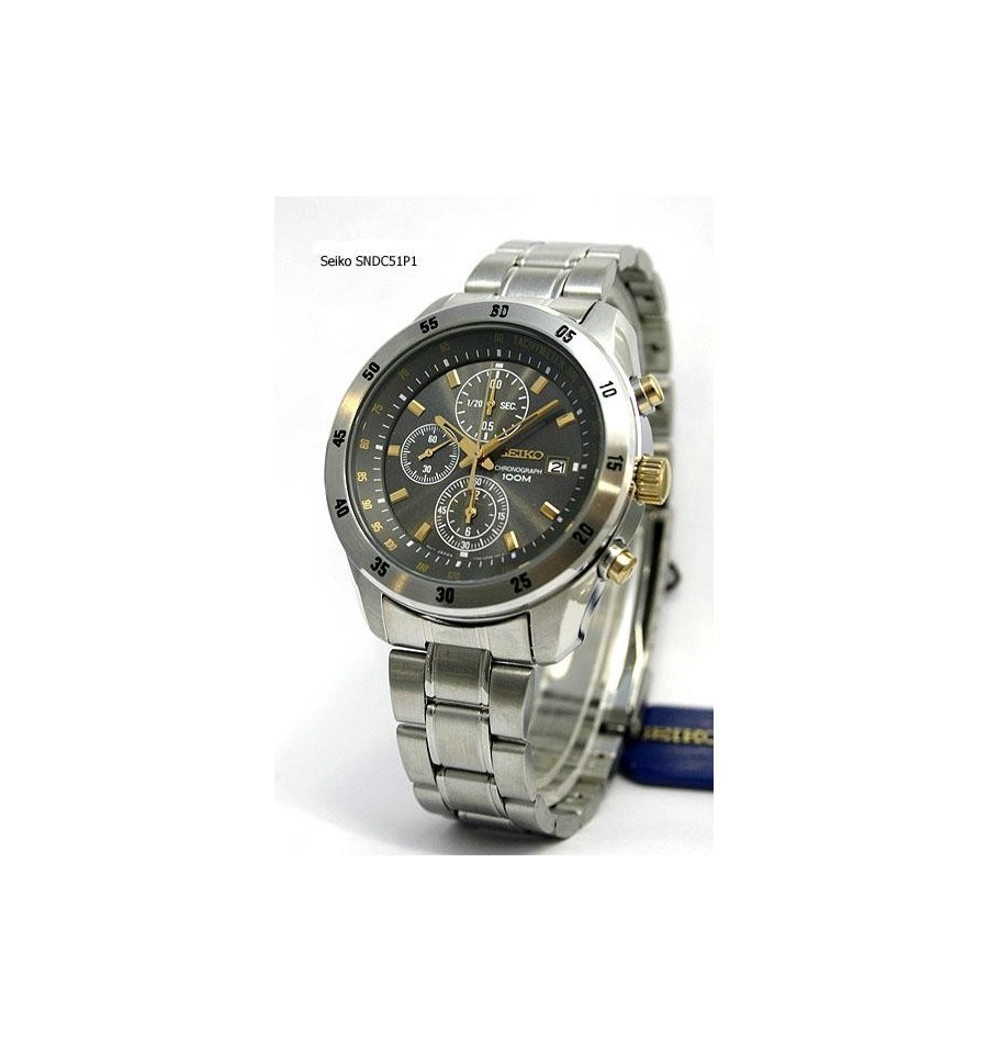 Ceas de mana barbatesc original Seiko Chronograph SNDC51P1, produs de renumitul Seiko Watches, are carcasa si bratara din otel inoxidabil in doua nuante argintiu cu auriu, cadranul maro inchis, si este dotat cu funtie cronograf. Geamul din cristal mineral hardlex rezistent la zgarieturi, iar sistemul de inchidere este de tip fluture. Seiko SNDC51 este dotat cu tahimetru, calendar si functie cronograf. Mecanismul ceasului este pe baza de quartz.