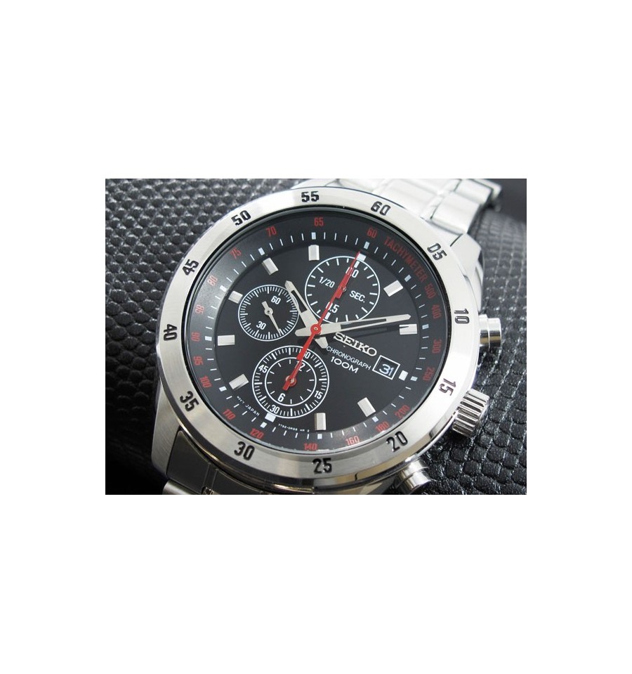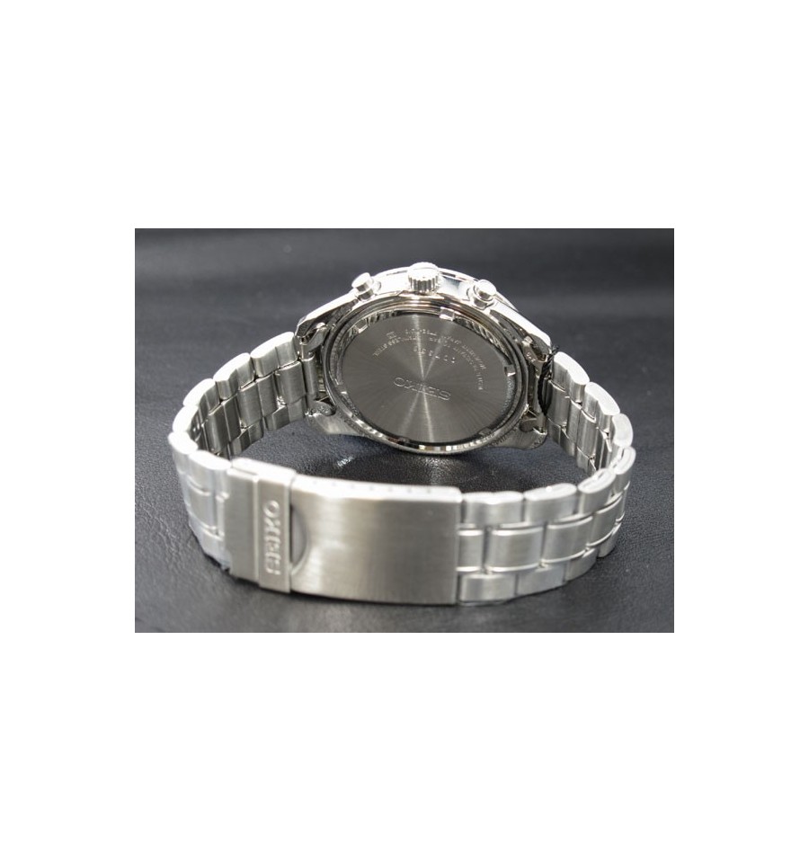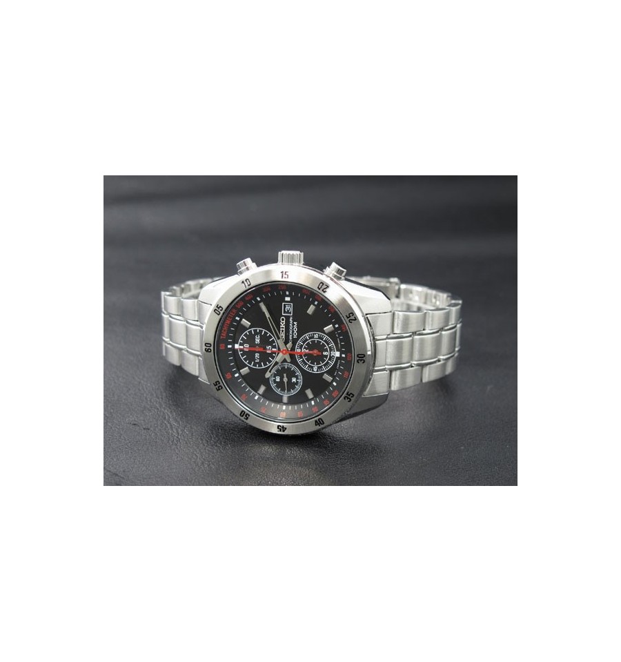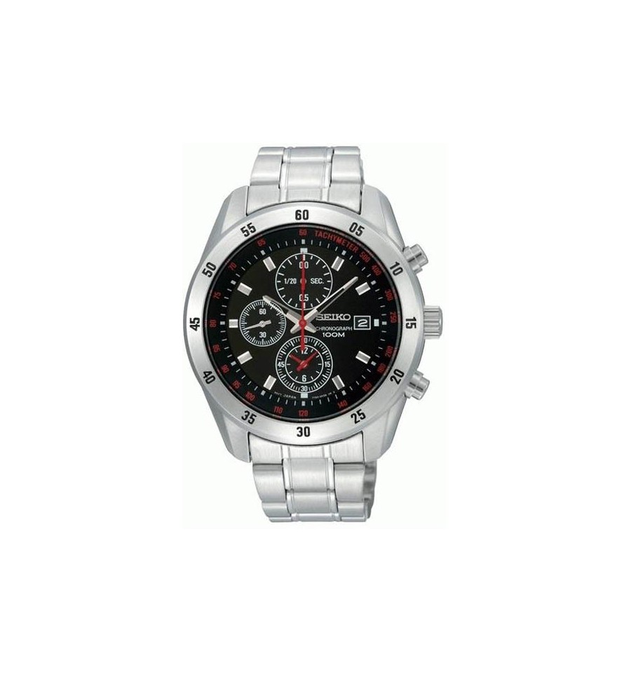 Ceas de mana barbatesc original Seiko Chronograph SNDC49P1, produs de renumitul Seiko Watches, are carcasa si bratara din otel inoxidabil argintiu, cadranul negru, si este dotat cu funtie cronograf. Geamul din cristal mineral hardlex rezistent la zgarieturi, iar sistemul de inchidere este de tip fluture. Seiko SNDC49 este dotat cu tahimetru, calendar si functie cronograf. Mecanismul ceasului este pe baza de quartz.