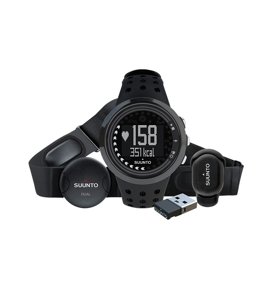 Suunto M5 All Black Running Pack include ceasul M5 All Black, Suunto Foot POD Mini, Suunto Movestick, si Suunto Dual Comfort Belt compatibil cu majoritatea exercitiilor cardio si solutii Fitness care permite primirea informatiilor in timp real.