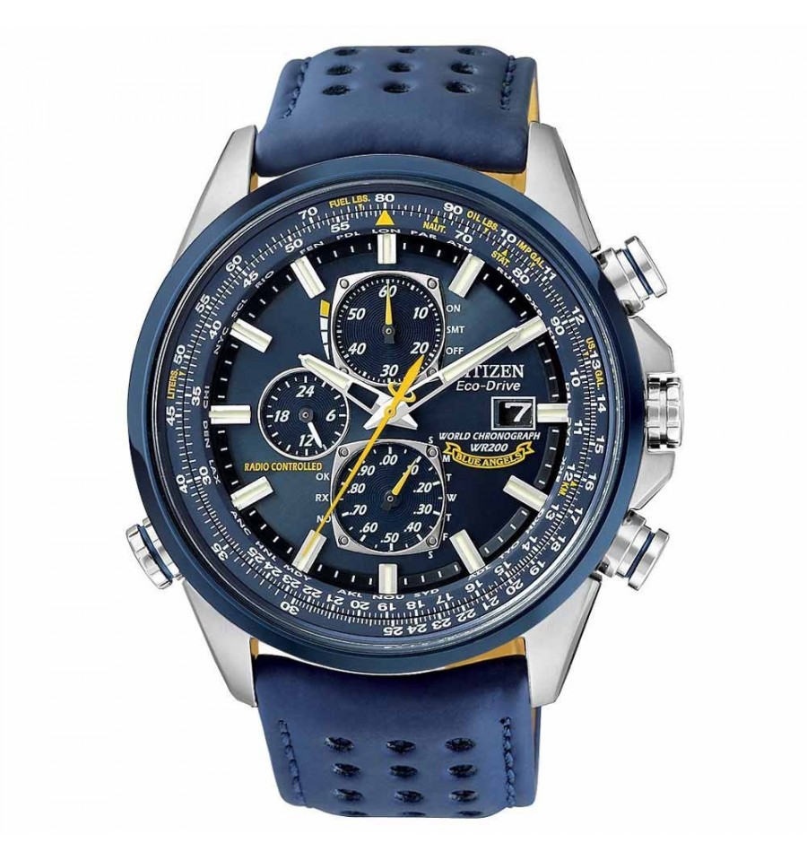 Ceas de mana barbatesc Perpetual Chrono A-T AT8020-03L, produs de renumitul Citizen, are precizie atomica cu acuratete radio controlata, sincronizindu-se prin radio cu staţiile de emisie care furnizează semnalul de calibrare; are carcasa din otel inoxidabil argintiu,curea de piele albastra, cadranul albastru, iar geamul este din safir antireflexiv. Ceasul este dotat cu functie cronograf,calendar perpetuu,indicator de energie. Ceasul converteste orice sursa de lumina fie naturala, fie artificiala, in energie utilizabila prin tehnologia Eco-Drive si are functie de avertizare de energie redusa.