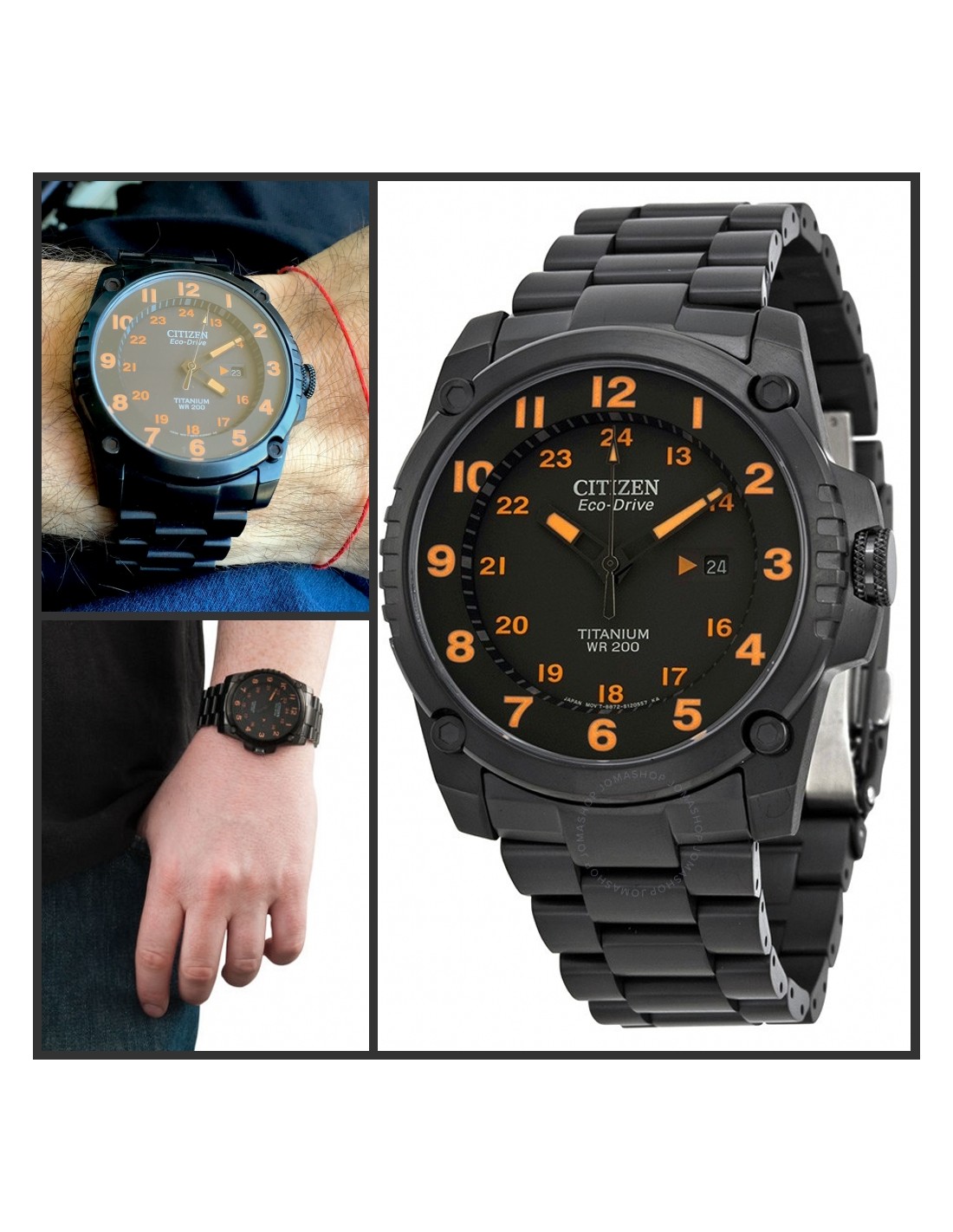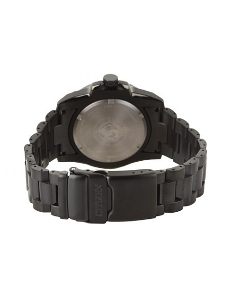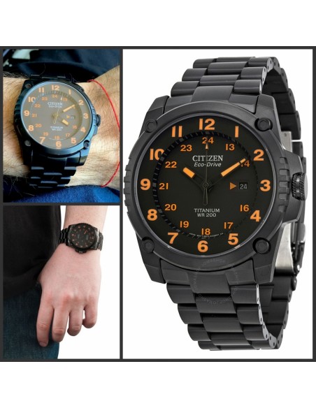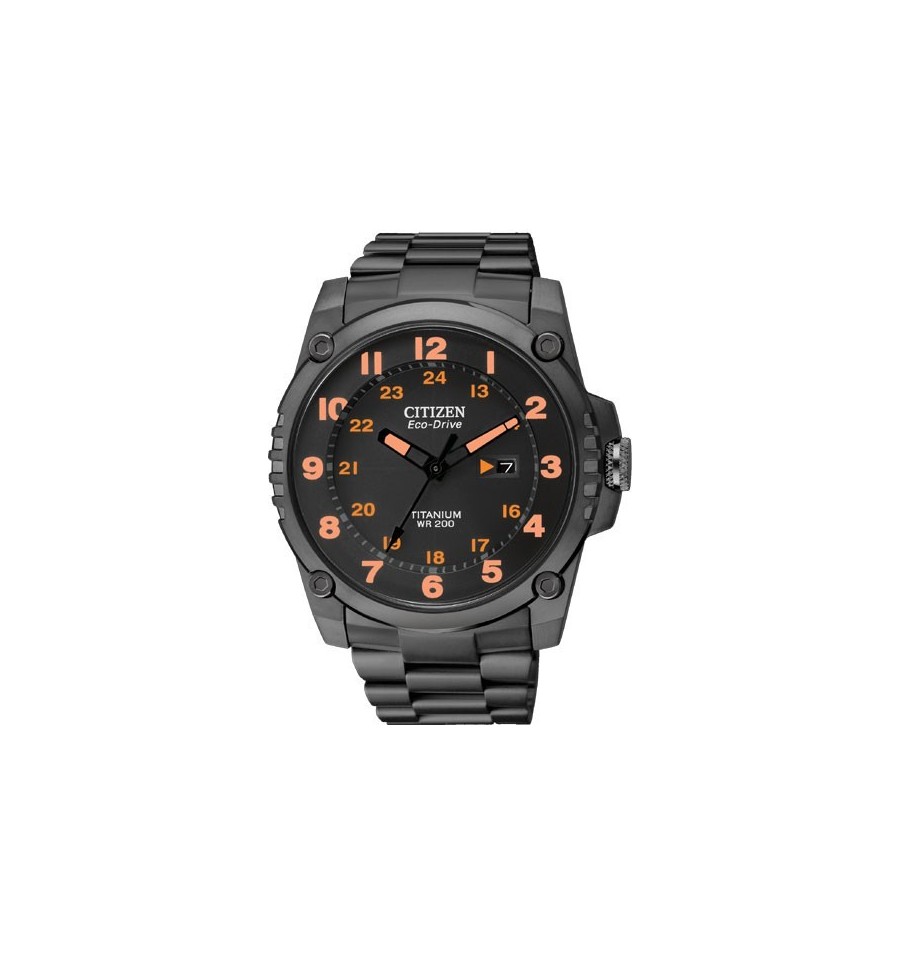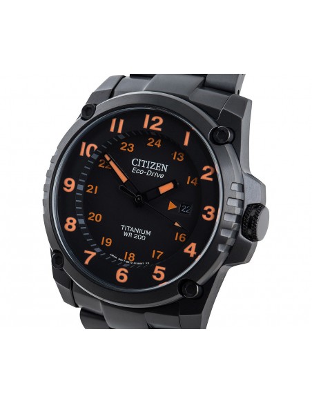Acest ceas de mana barbatesc, Super TitaniumBJ8075-58F, produs de Citizen Watches, are carcasa si bratara din titan de culare negru, cadranul negru cu indicatoarele si cifrele luminoase de culoare portocaliu. Ceasul converteste orice sursa de lumina fie naturala, fie artificiala, in energie utilizabila prin tehnologia Eco-Drive si are functie de avertizare de energie redusa.