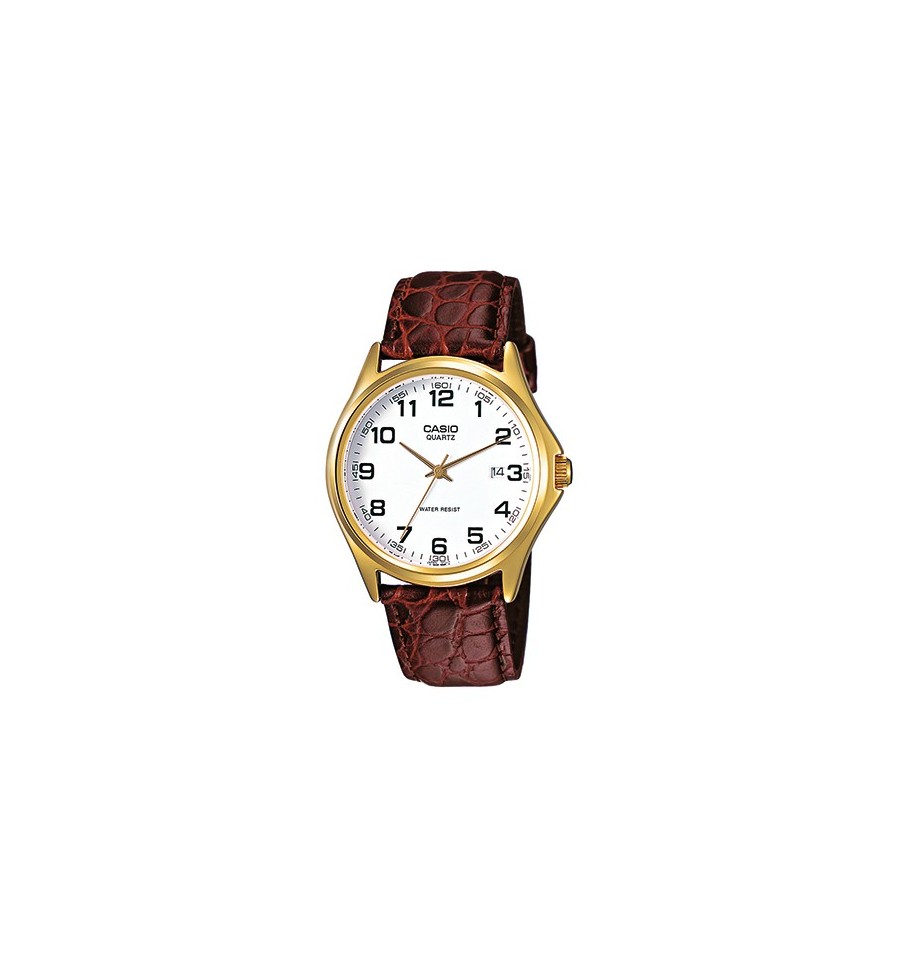 Acest ceas de mana barbatesc, MTP-1188Q-7B, produs de renumitul Casio Watches, are carcasa din otel inoxidabil aurit, curea din piele naturala maro, cadranul alb, iar geamul din cristal mineral.