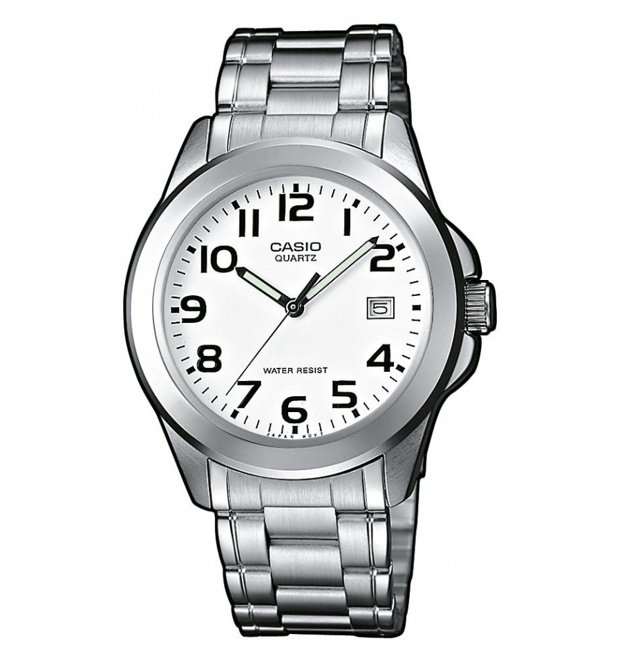 Acest ceas de mana barbatesc, MTP-1259D-7B, produs de renumitul Casio Watches, are carcasa din alama in nuante argintii, bratara din otel inoxidabil argintiu, cadranul alb cu indicatoare fosforescente "Neobrite".