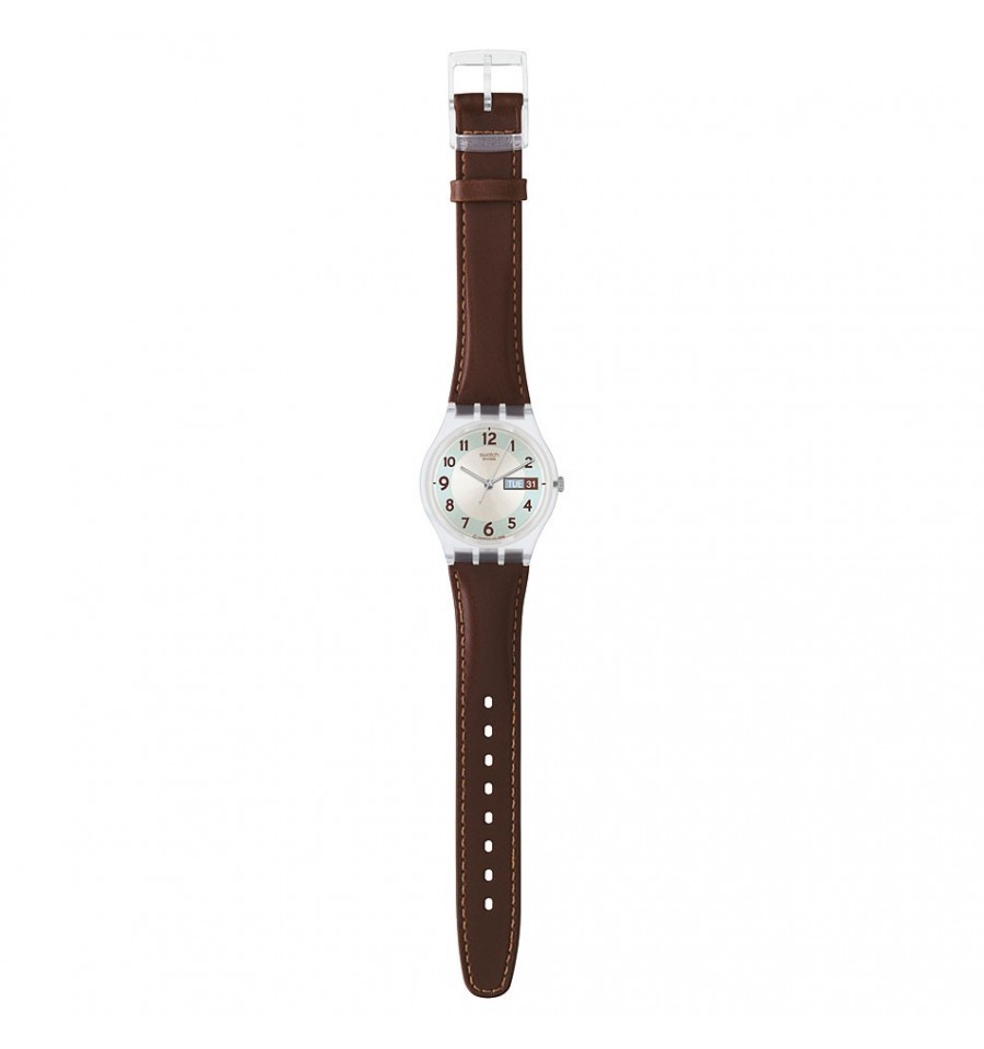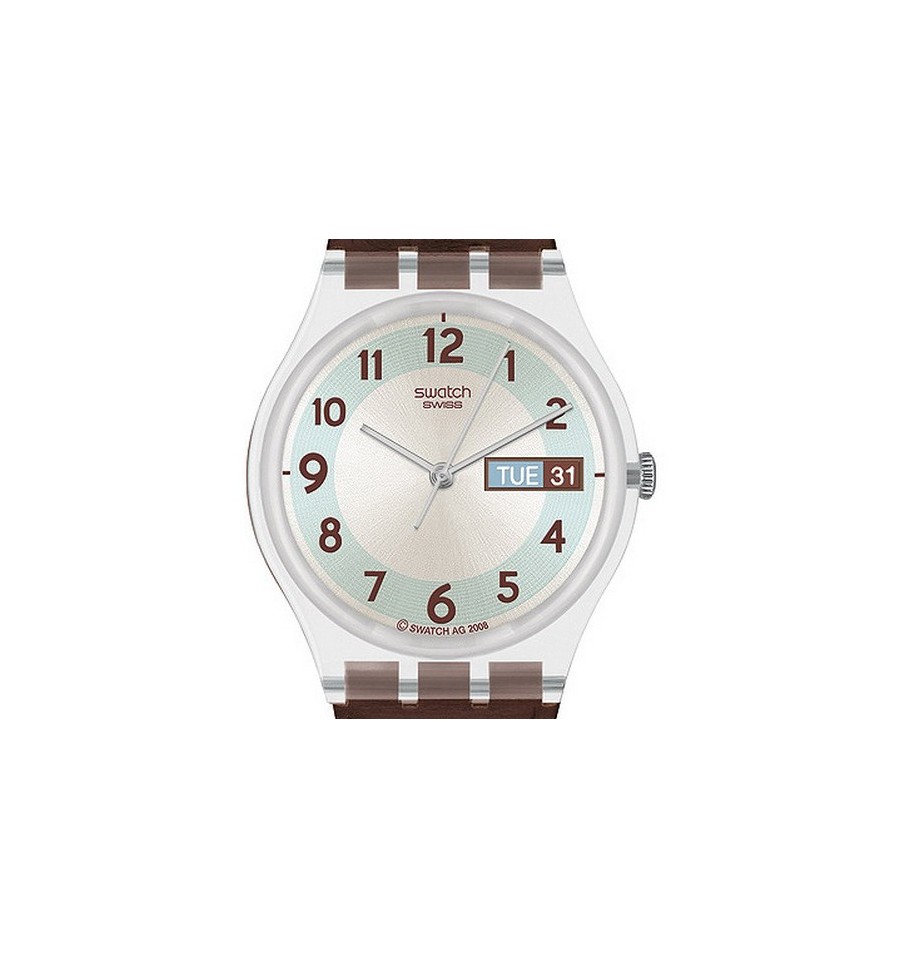 Ceasul acesta unisex este un produs al firmei renumite Swatch, din Elvetia. Face parte din seria Gent. Carcasa rotunda din plastic este deschisa la culoare. Cadranul este si el deschis la culoare si usor perlat, avand pe el si un cerc cu usoare irizatii bleu. Ciferele arabe si aratatoarele au un desen interesant si sunt fosforescente. Arata ziua si data in dreptul ori trei. Este un ceas deosebit de frumos, inclusiv pentru ocazii festive. Rezista la apa.