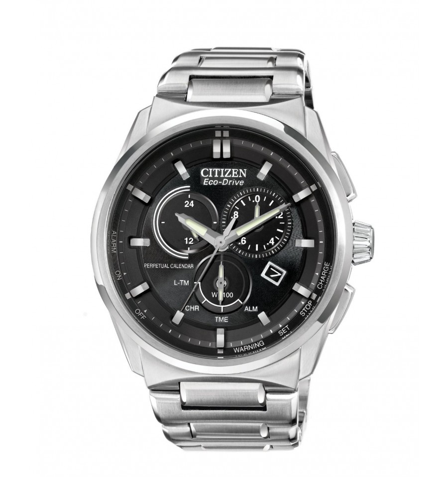Acest ceas de mana barbatesc, BL5480-53E, produs de renumitul Citizen Watches, are carcasa si bratara din otel inoxidabil argintiu, cadranul negru si trei subcadrane, geam anti-reflexiv din cristal mineral. Ceasul este dotat cu functie chronograph ce masoara pana la 60 minute in unitati de1/20 secunde si perpetual calendar chonograph si care converteste orice sursa de lumina fie naturala, fie artificiala, in energie utilizabila prin tehnologia Eco-Drive.