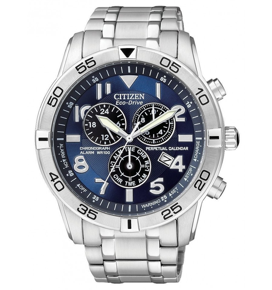 Acest ceas de mana barbatesc ,Citizen Calendar Perpetuu Eco Drive BL5470-57L, produs de renumitul Citizen Watch, are carcasa si bratara din otel inoxidabil argintiu, este dotat cu cronograf, alarma si calendar perpetuu.Geamul este din cristal mineral rezistent la zgarieturi. Mecanismul ceasului este Eco-Drive. Ceasul converteste orice sursa de lumina fie naturala, fie artificiala, in energie utilizabila prin tehnologia Eco-Drive. Ceasul are o rezistenta de 100 m la apa deci se poate inota fara problema cu acest model.