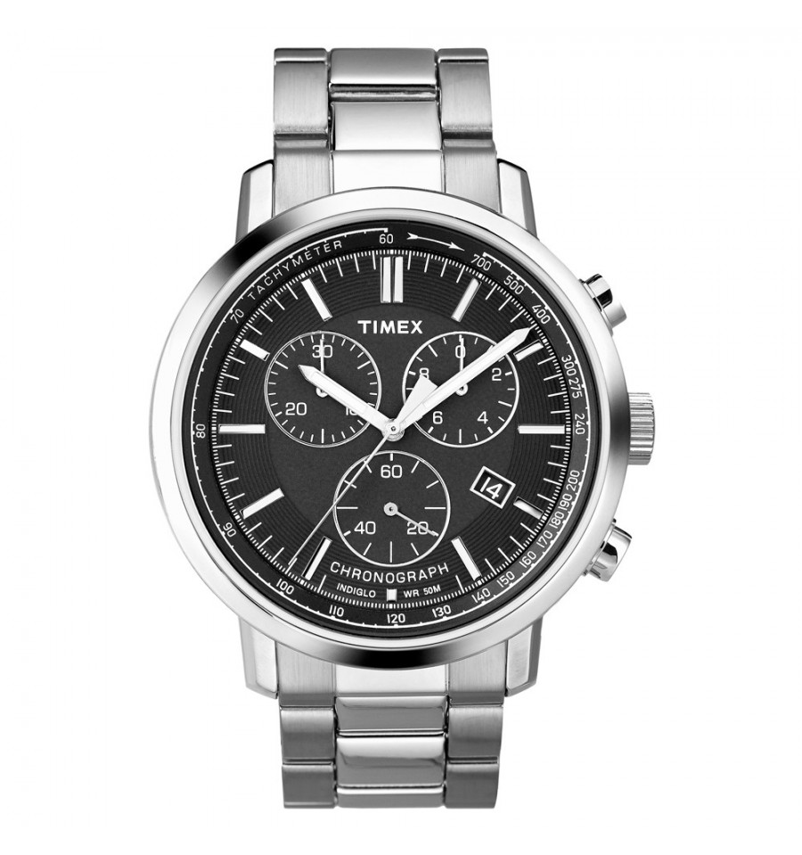 Acest ceas de mana barbatesc, T2N557, produs de renumitul Timex, are carcasa si bratara din otel inoxidabil argintiu, cadranul negru, geamul din cristal mineral, iar sistemul de inchidere este de tip deployant. Ceasul este dotat cu functie cronograf si calendar. Mecanismul ceasului este pe baza de quartz.