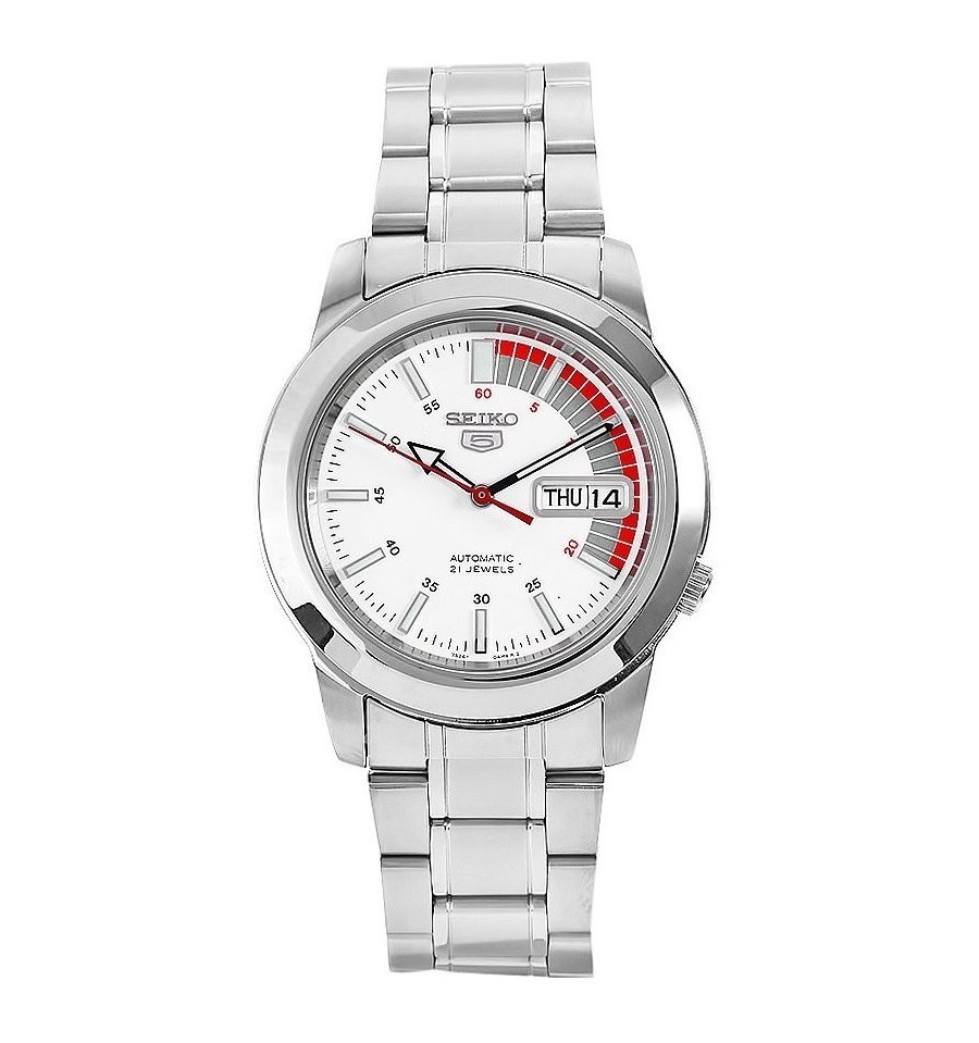 Ceas de mana de la vestita firma japoneza SEIKO Watch din seria Seiko 5 automatic model SNKK25 cu mecanism 7S26 cu 21 Jewels- rubine, rezistent la apa 30m, arata data si ziua in engleza sau franceza, carcasa si bratara sunt din otel inox,catarama cu buton pentru deschidere prin apasare, geamul din cristal Hardlex rezistent la zgarieturi,indicatoarele si limbile sunt luminiscente, spatele infiletabil, grosimea carcasei 12mm, diametrul 38mm, cadran alb, produsul vine ambalat in cutie, cu manual de instructiuni, garantie.