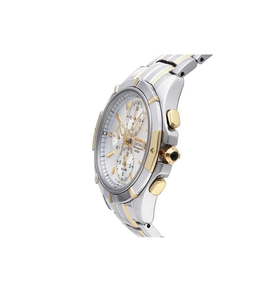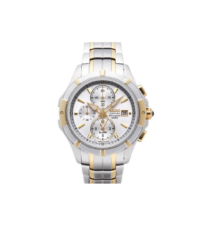 Ceasul de mana barbatesc original Coutura Alarm Chronograph SNAE74P1, produs de renumita firma Seiko Watches, are carcasa si bratara din otel inoxidabil in doua nuante, cadranul alb cu accente aurii, geamul din safir, coroana din Cabochon.Mecanismul ceasului este pe baza de quartz. Ceasul vine complet cu cutie, garantie si manual.
