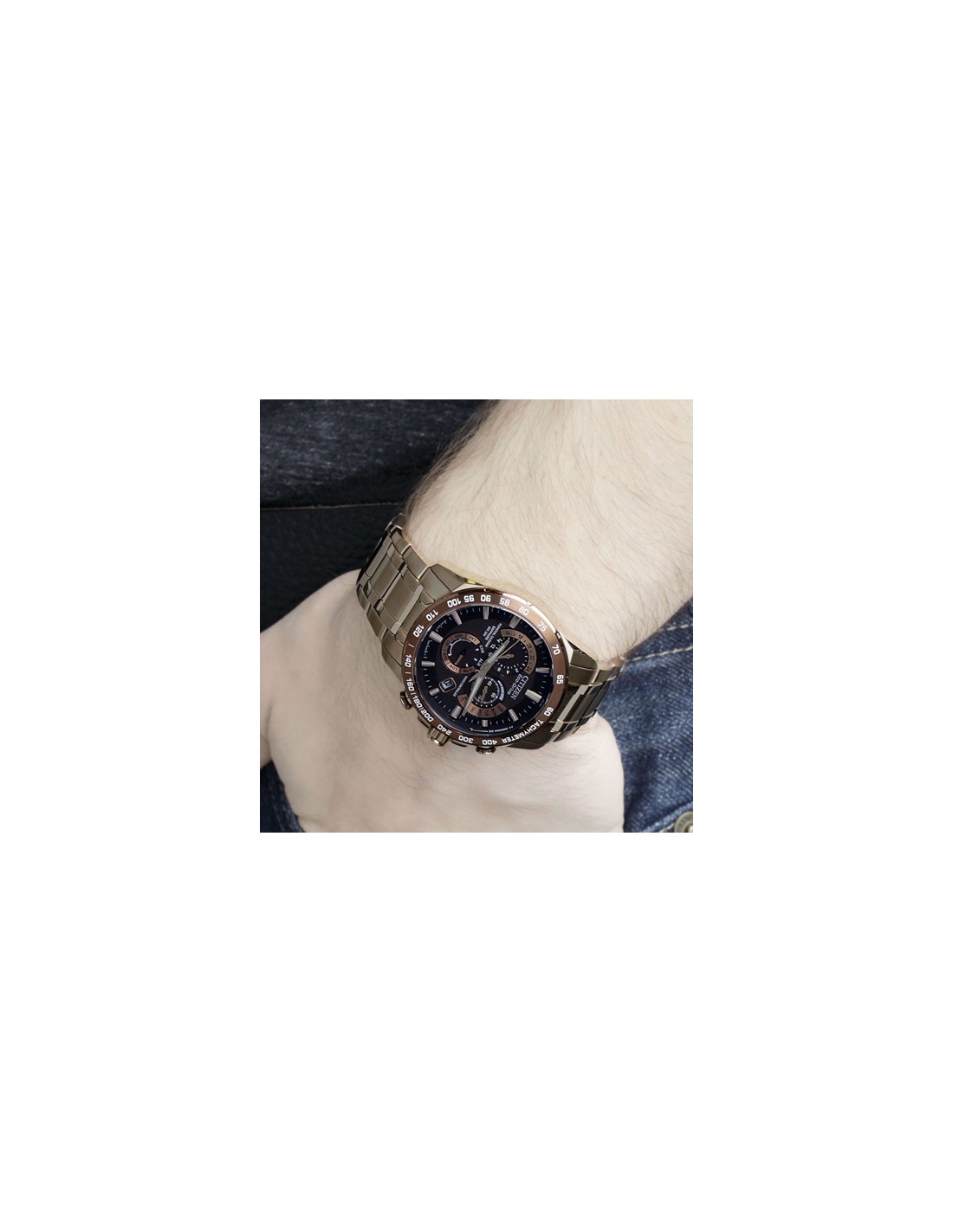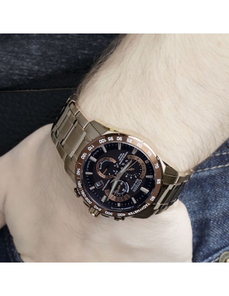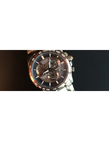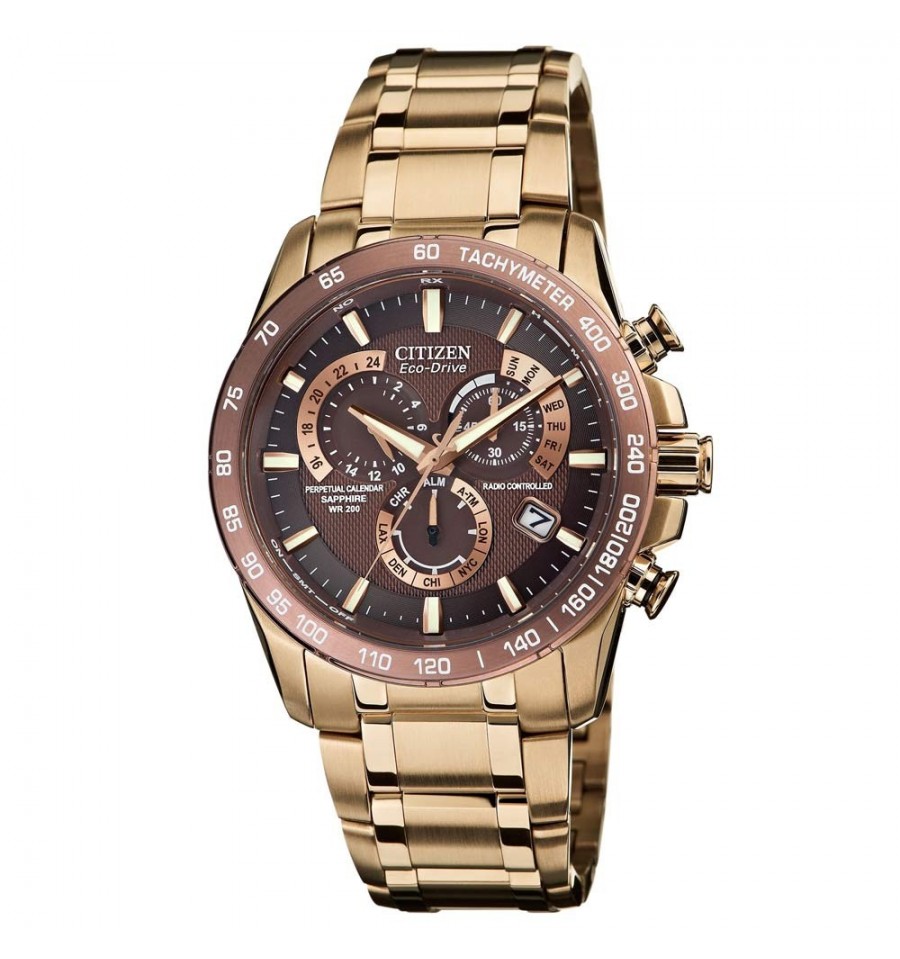 Acest ceas de mana barbatesc, Perpetual Chrono A-T AT4106-52X, produs de renumitul producator Citizen, are carcasa si bratara din otel inoxidabil placat cu aur roz, cadranul negru cu maro, iar geamul este din safir antireflexiv. Ceasul este dotat cu tahimetru, functie cronograf, alarma si are precizie atomica cu acuratete radio controlata din 5 fuse orare. Ceasul converteste orice sursa de lumina fie naturala, fie artificiala, in energie utilizabila prin tehnologia Eco-Drive si are functie de avertizare de energie redusa.