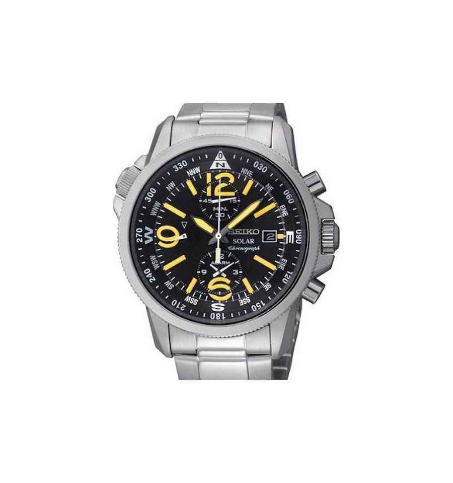 Ceas de mana barbatesc original Seiko Pilot Solar Chronograph SSC093, produs de renumitul producator Seiko Watch, are carcasa si bratara din otel inoxidabil argintiu,cifre mari fosforescente, iar mecanismul este solar, ceasul incarcandu-se prin energie solara.