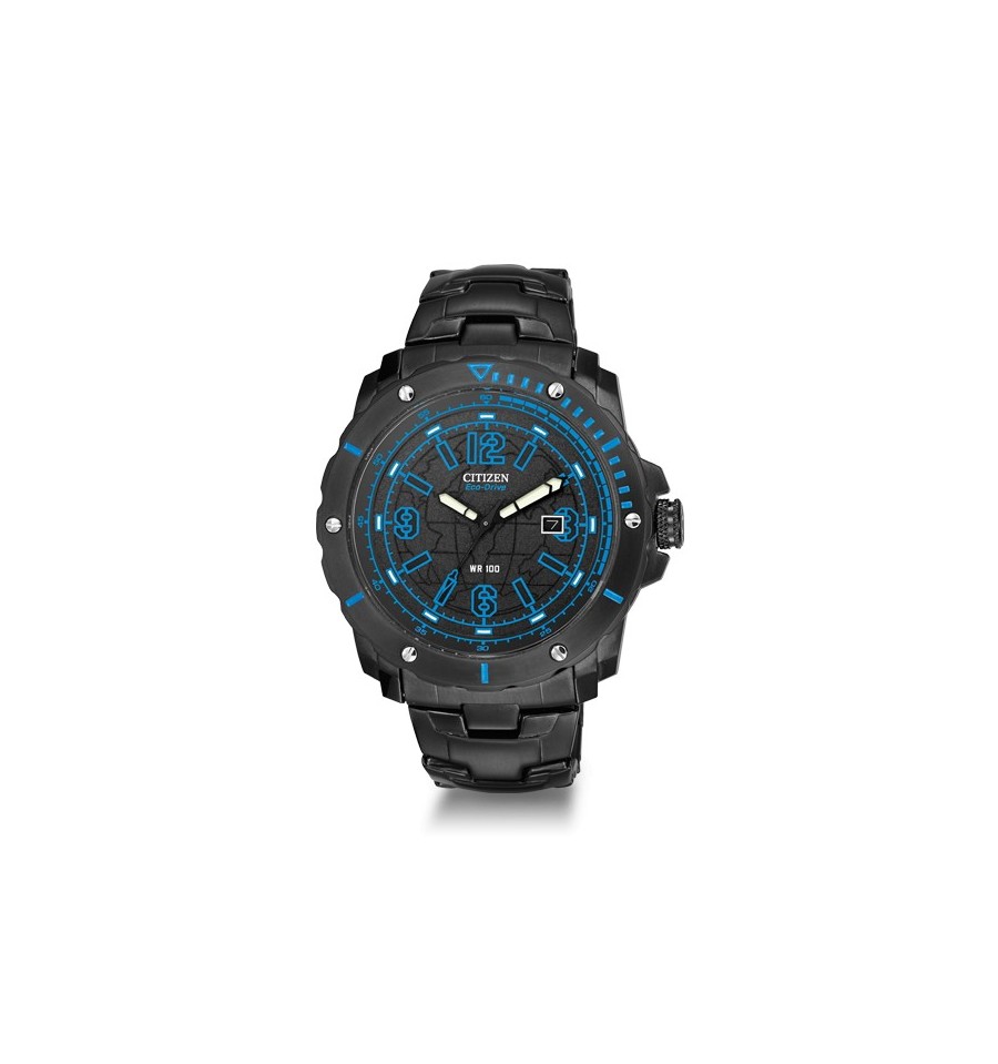Acest ceas de mana barbatesc, WDR BM7277-50E, produs de renumitul Citizen, are carcasa si bratara din otel inoxidabil negru, bezel decorativ cu accente albastru electric, cadranul negru si albastru pe care este printat harta lumii, geamul din cristal mineral, iar sistemul de inchidere este de tip fluture cu buton de siguranta.