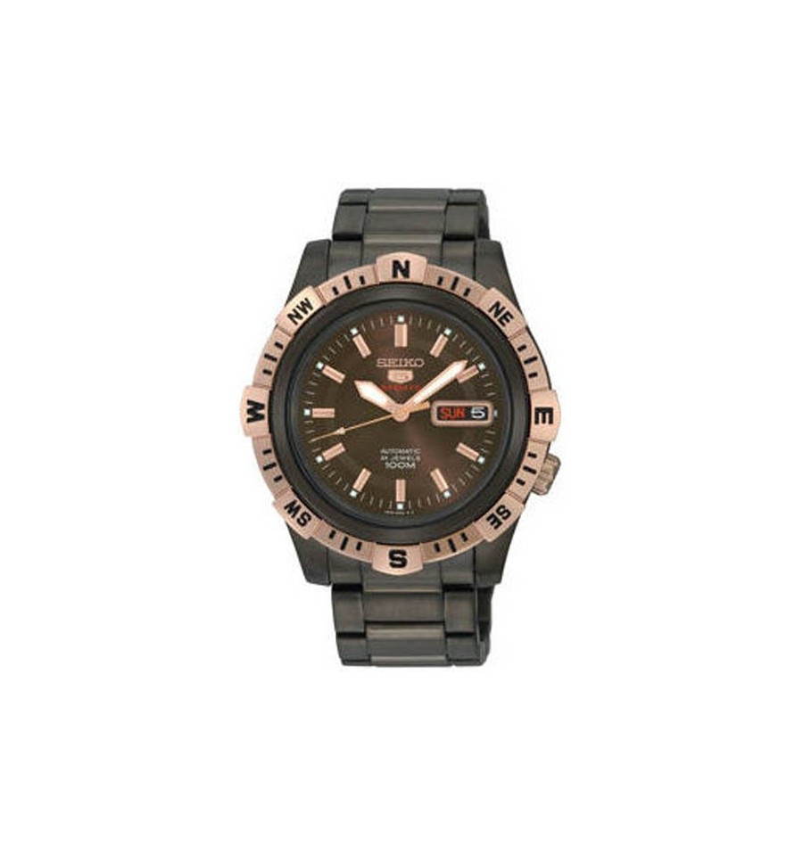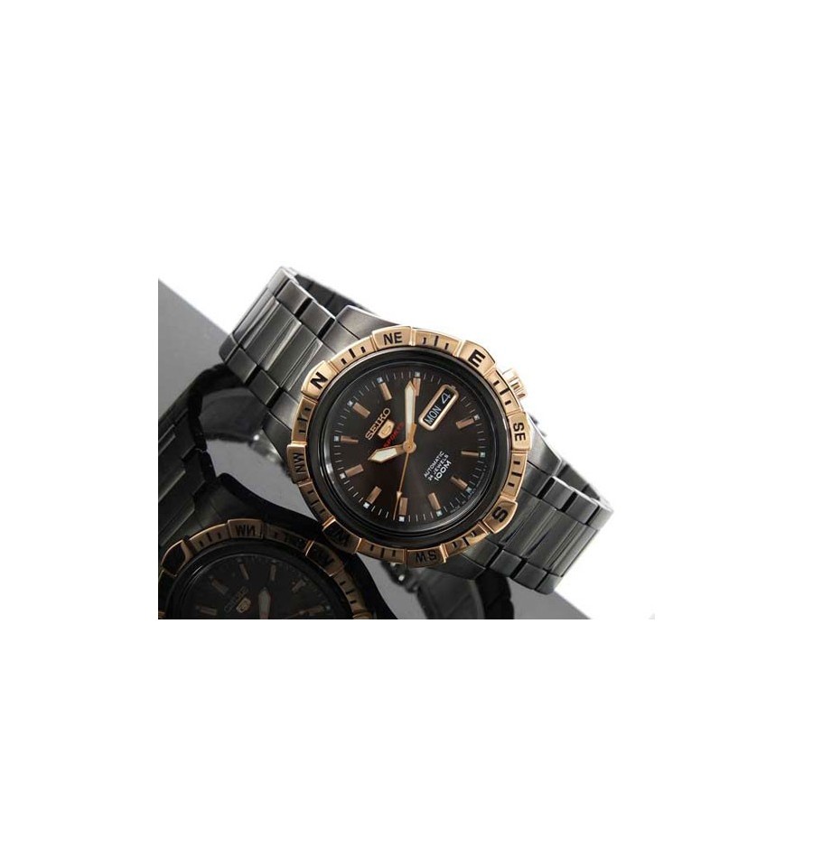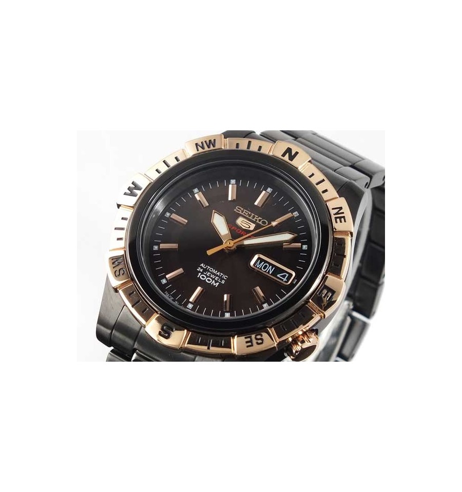 Acest ceas de mana este realizat de renumitul producator japonez Seiko Watch si are mecanism automatic 24 de rubine 4R36. Ceasul si bratara sunt placate negru,iar bezelul rotativ placat cu aur si 100m WR. Ceasul vine complet cu cutie, manual de utilizare si un an garantie.