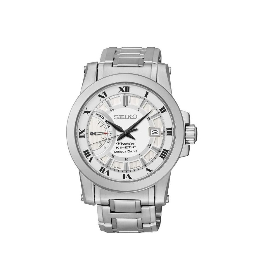 Acest ceas de mana barbatesc original Premier Kintetic Direct Drive SRG007P1, produs de renumitul Seiko Watches, are carcasa si bratara din otel inoxidabil, cadranul alb, geamul din safir, iar sistemul de inchidere este de tip fluture. Nu necesita baterie deoarece este un ceas kinetic.