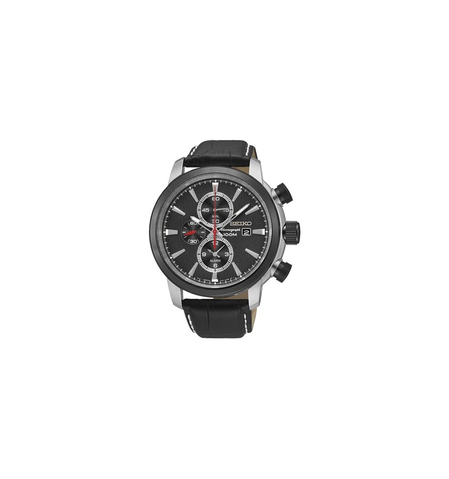 Acest ceas de mana barbatesc original, Chonograph SNAF47P2, produs de Seiko Watches, are carcasa din otel inoxidabil argintiu, bezelul negru, cadranul negru, geamul din cristal mineral intarit, curea din piele neagra, inchisa prin catarama. Mecanismul ceasului este pe baza de quartz.