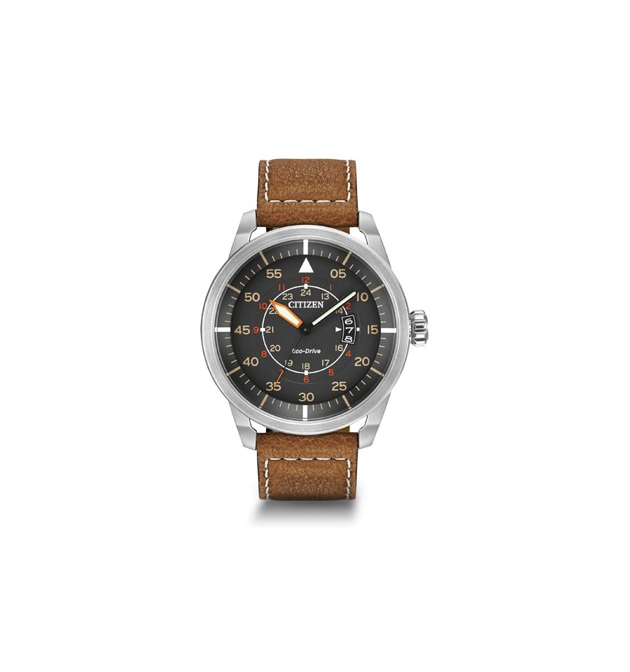 Acest ceas de mana barbatesc, Avion AW1361-10H, produs de renumitul Citizen watches, are carcasa din otel inoxidabil, geamul din cristal mineral, curea din piele maro, inchisa prin catarama.