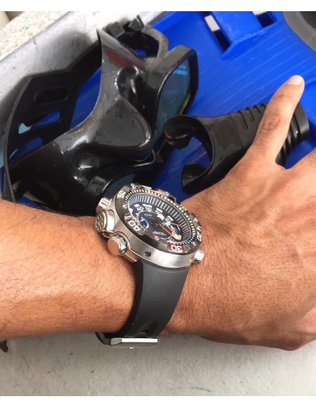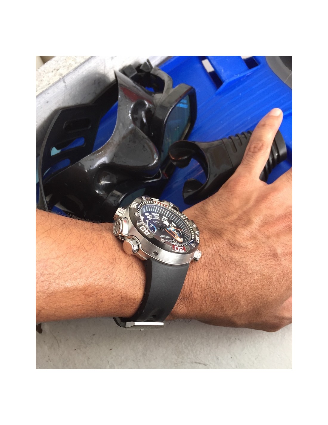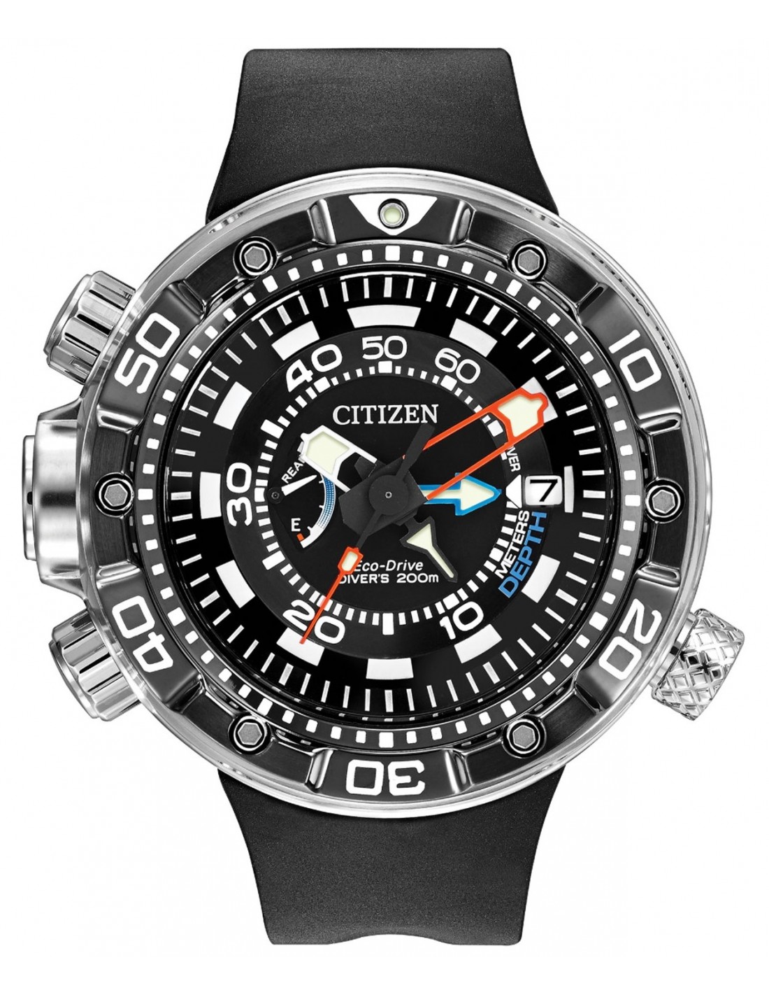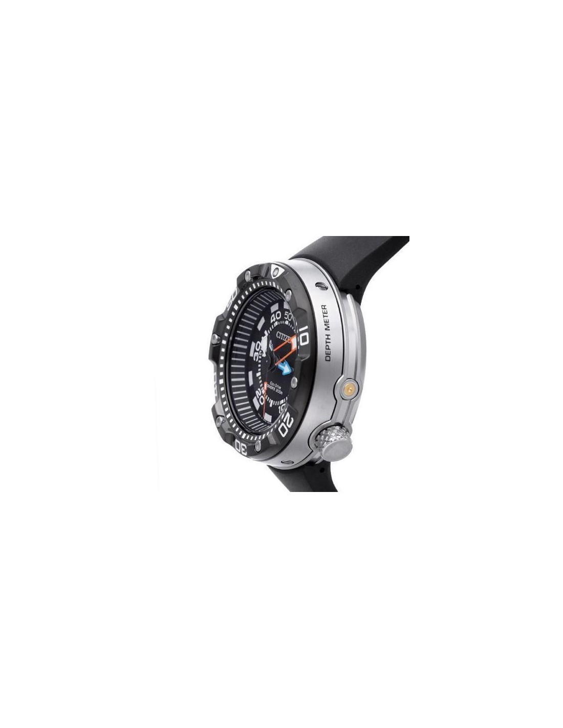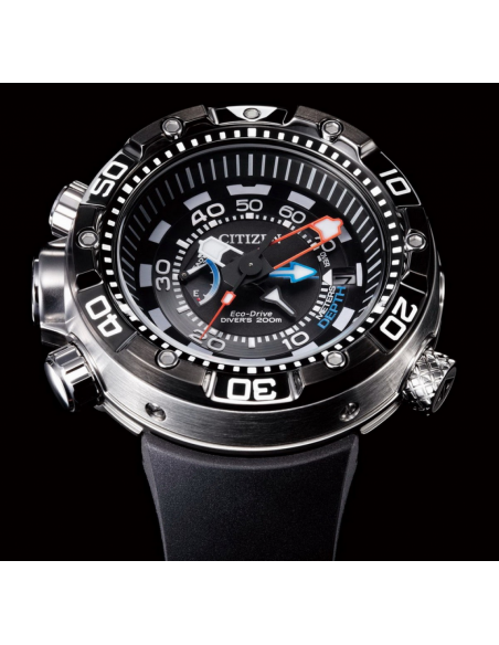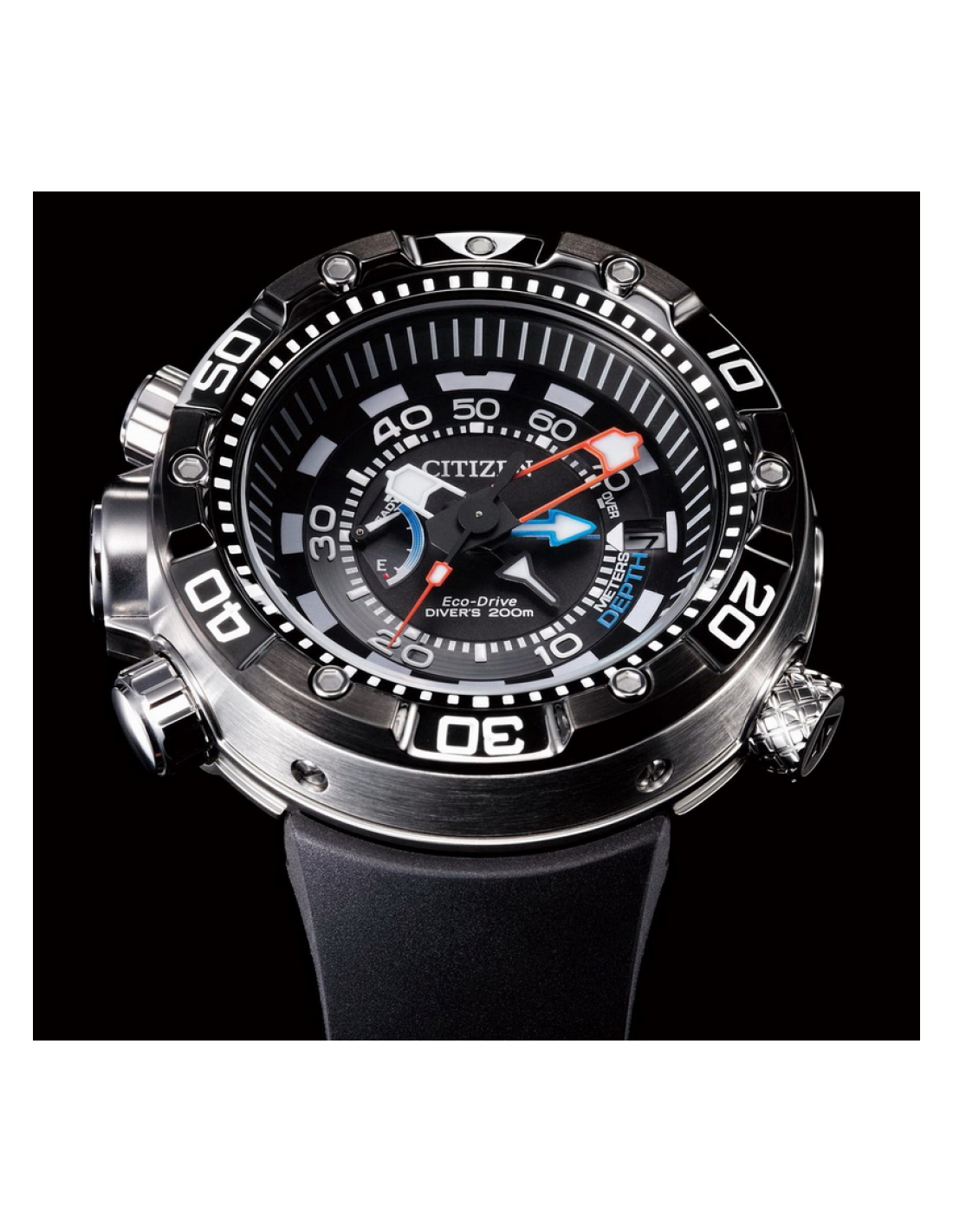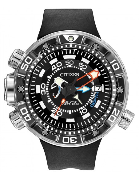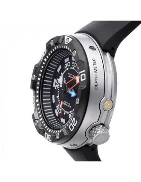 Acest ceas de mana barbatesc, Promaster Aqualand Deph Meter BN2029-01E, produs de Citizen Watches, are carcasa din otel inoxidabil, bezel rotativ, cadranul negru, geamul din cristal mineral antireflexiv, curea din poliuretan neagra, inchisa prin catarama. Ceasul analog converteste orice sursa de lumina fie naturala, fie artificiala prin tehnologia Eco-Drive si nu necesita baterie.
