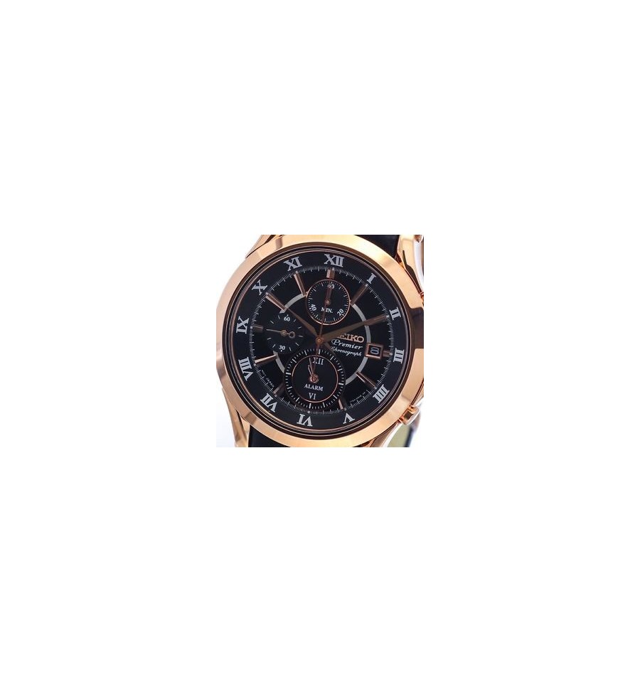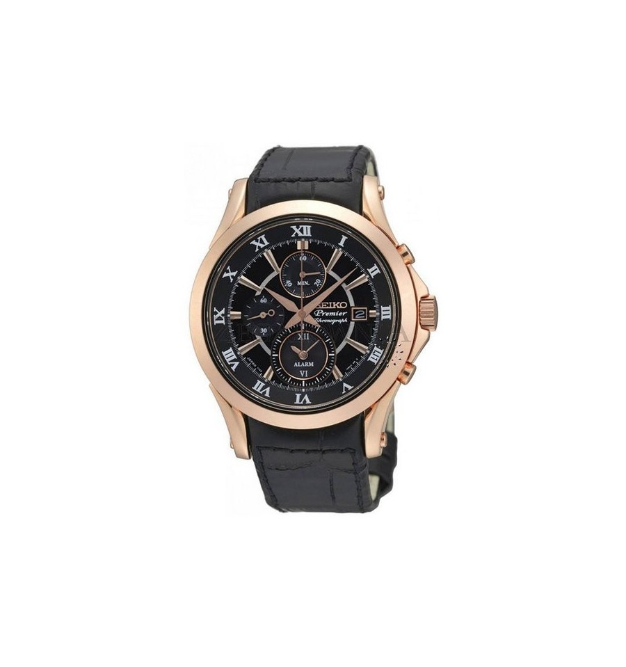 Acest ceas de mana barbatesc, Premier Chronograph SNAF24P1, produs de Seiko Watches, are carcasa din otel inoxidabil, geamul din cristal safir rezistent la zgarieturi, cadranul negru, curea din piele inchisa printr-un sistem de tip deployant. Mecanismul este pe baza de quartz.