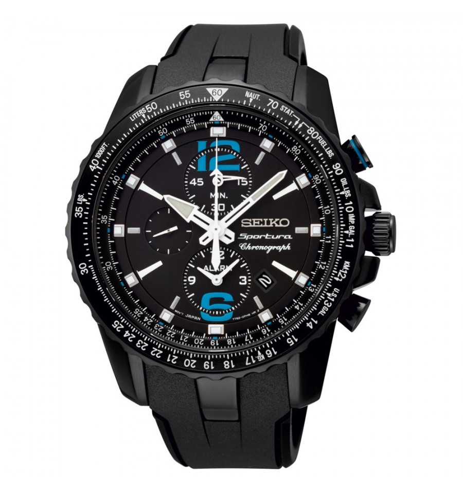 Acest ceas de mana barbatesc, Sportura SNAF25P1, produs de Seiko Watches, are carcasa din otel inoxidabil placat ionic negru, geamul din safir cristal, cadranul negru cu accent albastre,curea din poliuretan, inchisa prin catarama. Mecanismul este pe baza de quartz.