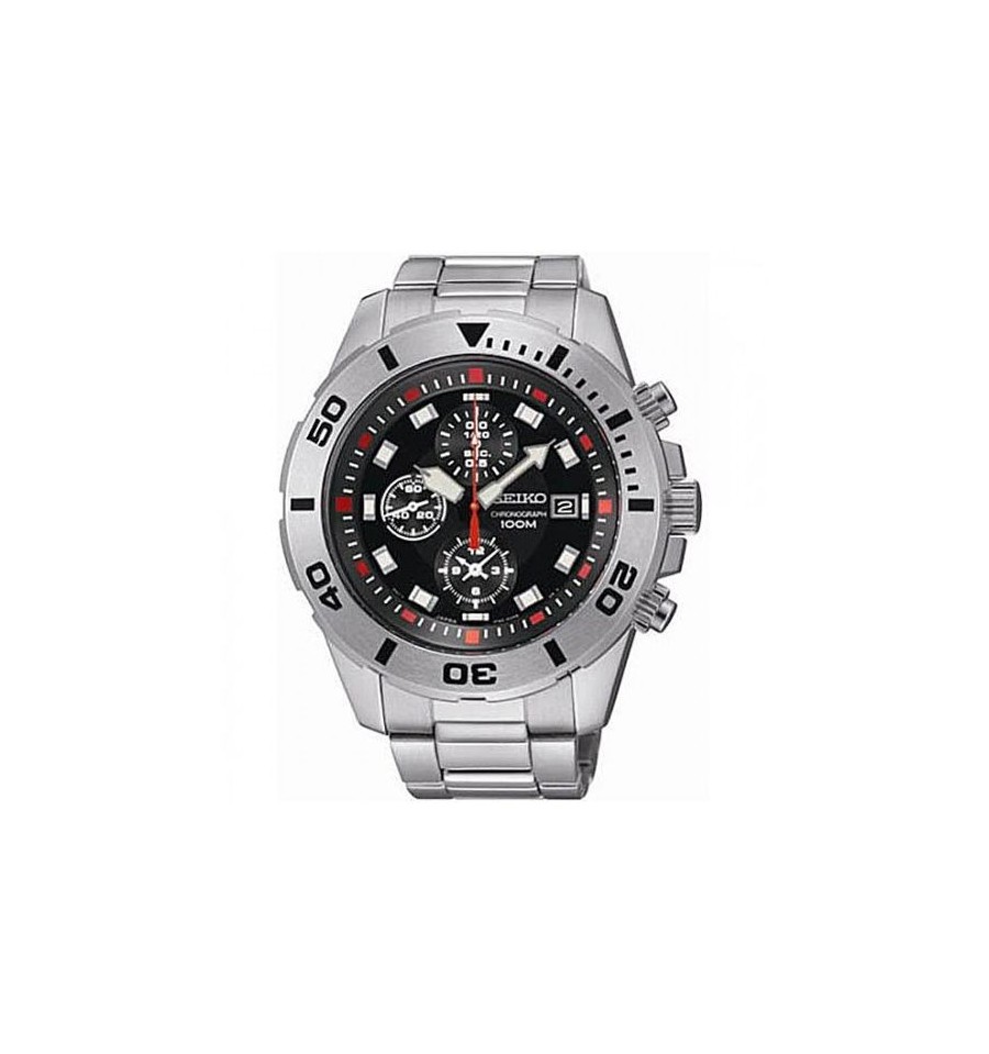 Acest ceas de mana barbatesc, Chronograph SNDD95P1, produs de Seiko Watches, are carcasa si bratara din otel inoxidabil, bezel rotativ uni-directional, cadranul negru, geamul din cristal mineral rezistent la zgarieturi (hardlex), iar sistemul de inchidere este de tip deployant cu buton de siguranta. Mecanismul este pe baza de quartz.