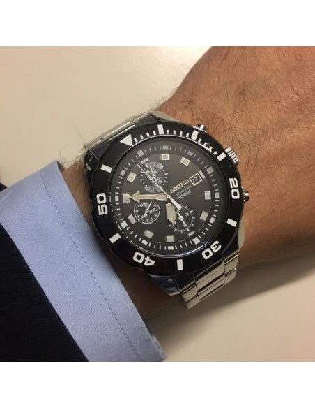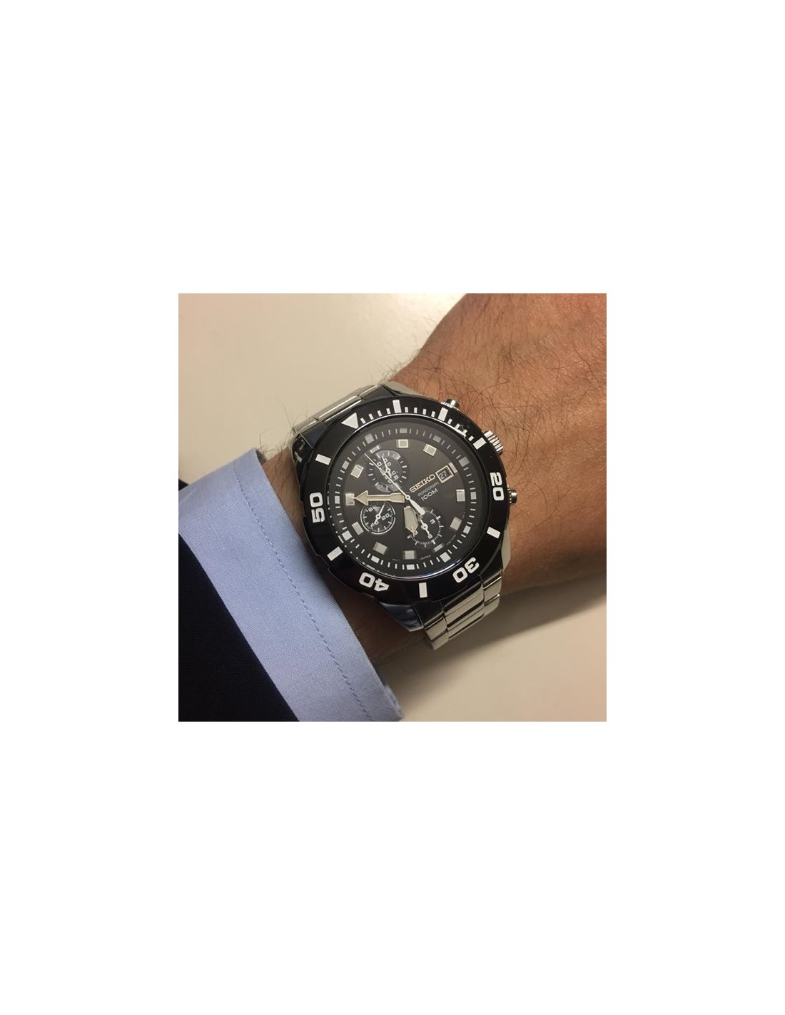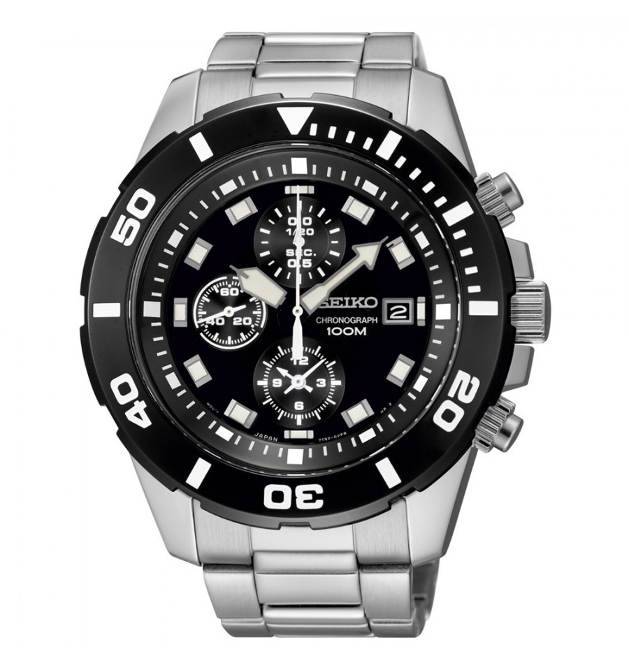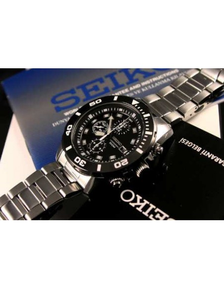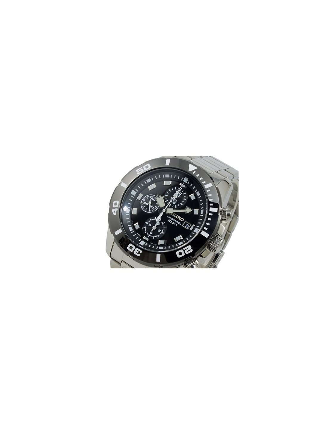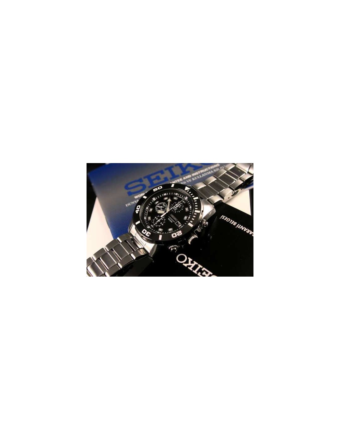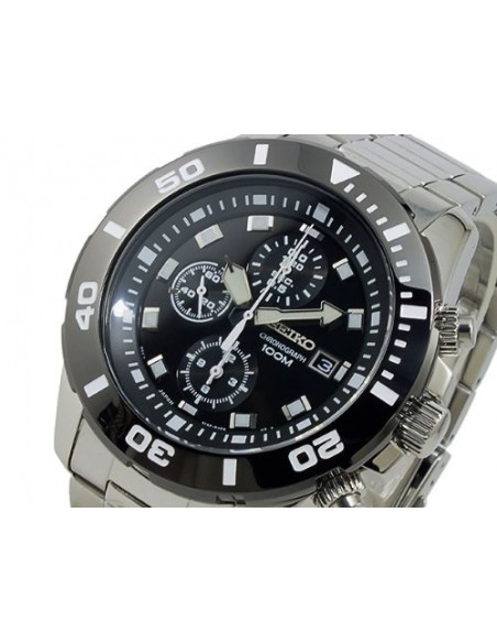 Acest ceas de mana barbatesc, Chronograph SNDD99P1, produs de Seiko Watches, are carcasa si bratara din otel inoxidabil, bezel negru rotativ uni-directional, cadranul negru cu lumini Lumibrite, geamul din cristal mineral rezistent la zgarieturi (hardlex), iar sistemul de inchidere este de tip deployant cu buton de siguranta. Mecanismul este pe baza de quartz.