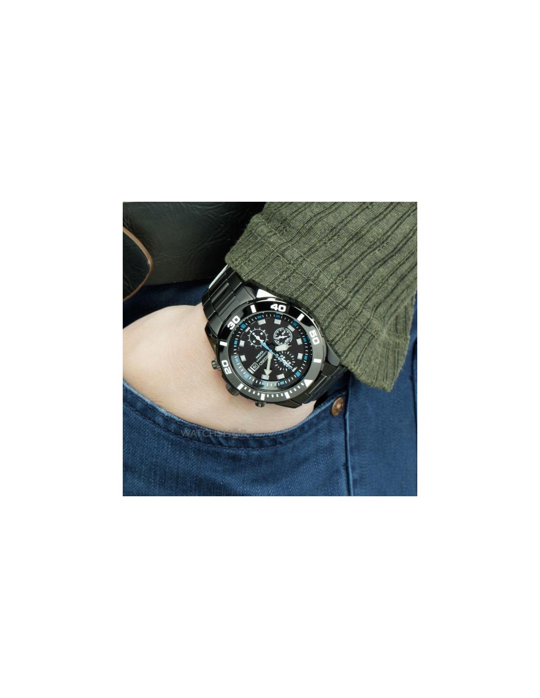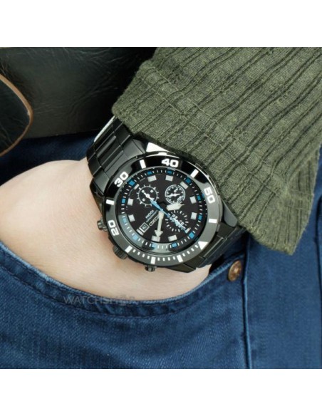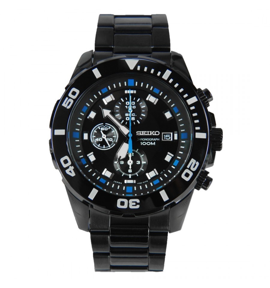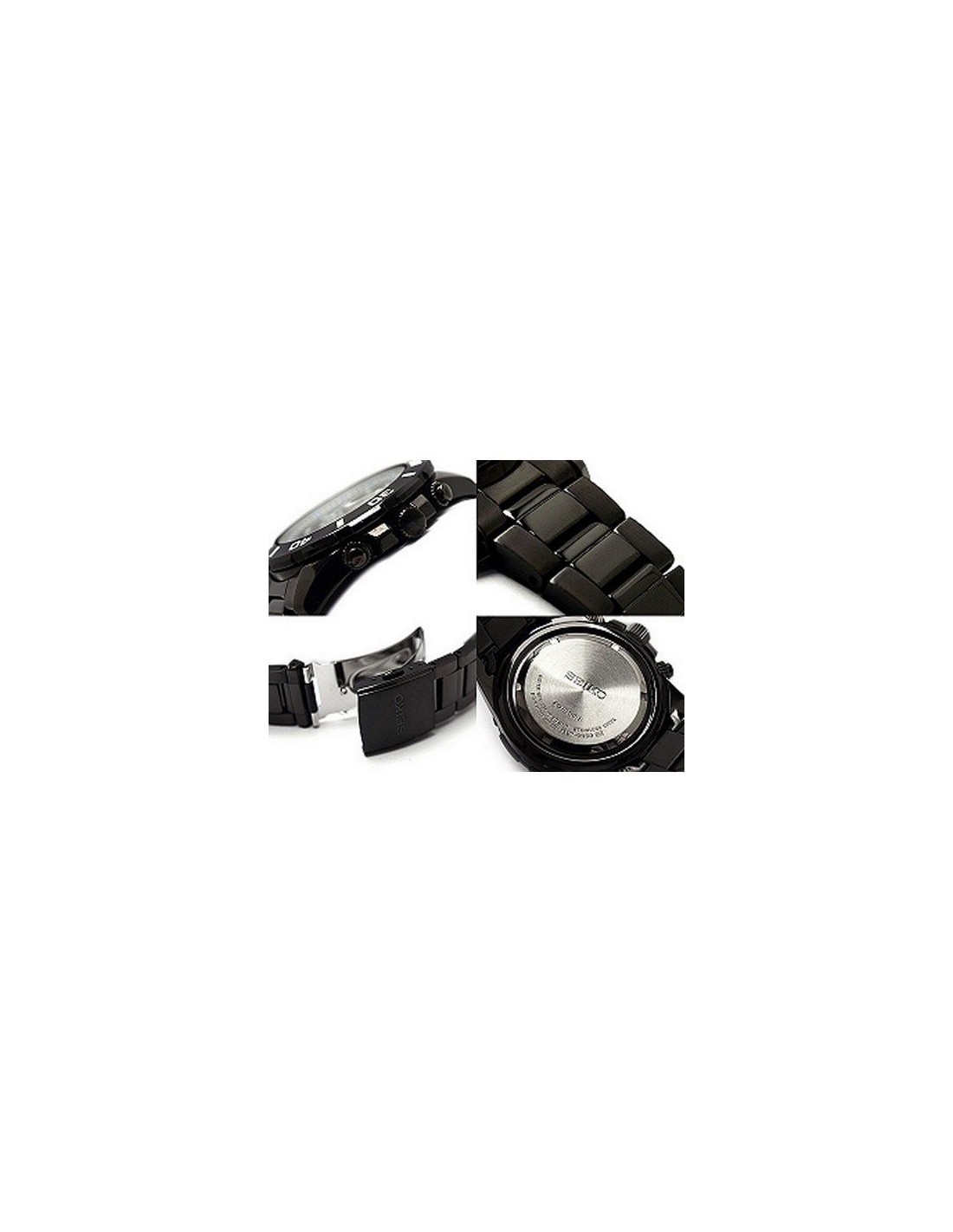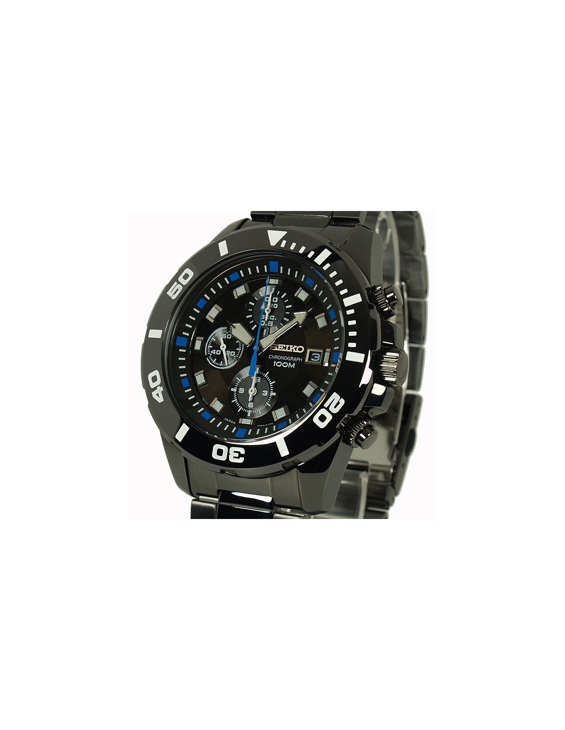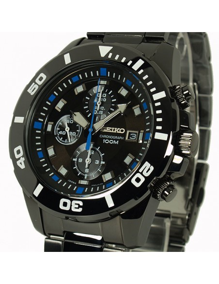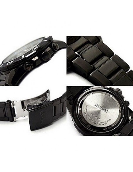 Acest ceas de mana barbatesc, Chronograph SNDE01P1, produs de Seiko Watches, are carcasa si bratara din otel inoxidabil placat ionic negru, bezel negru rotativ uni-directional, cadranul negru cu lumini Lumibrite, geamul din cristal mineral rezistent la zgarieturi (hardlex), iar sistemul de inchidere este de tip fluture cu buton de siguranta. Mecanismul este pe baza de quartz.