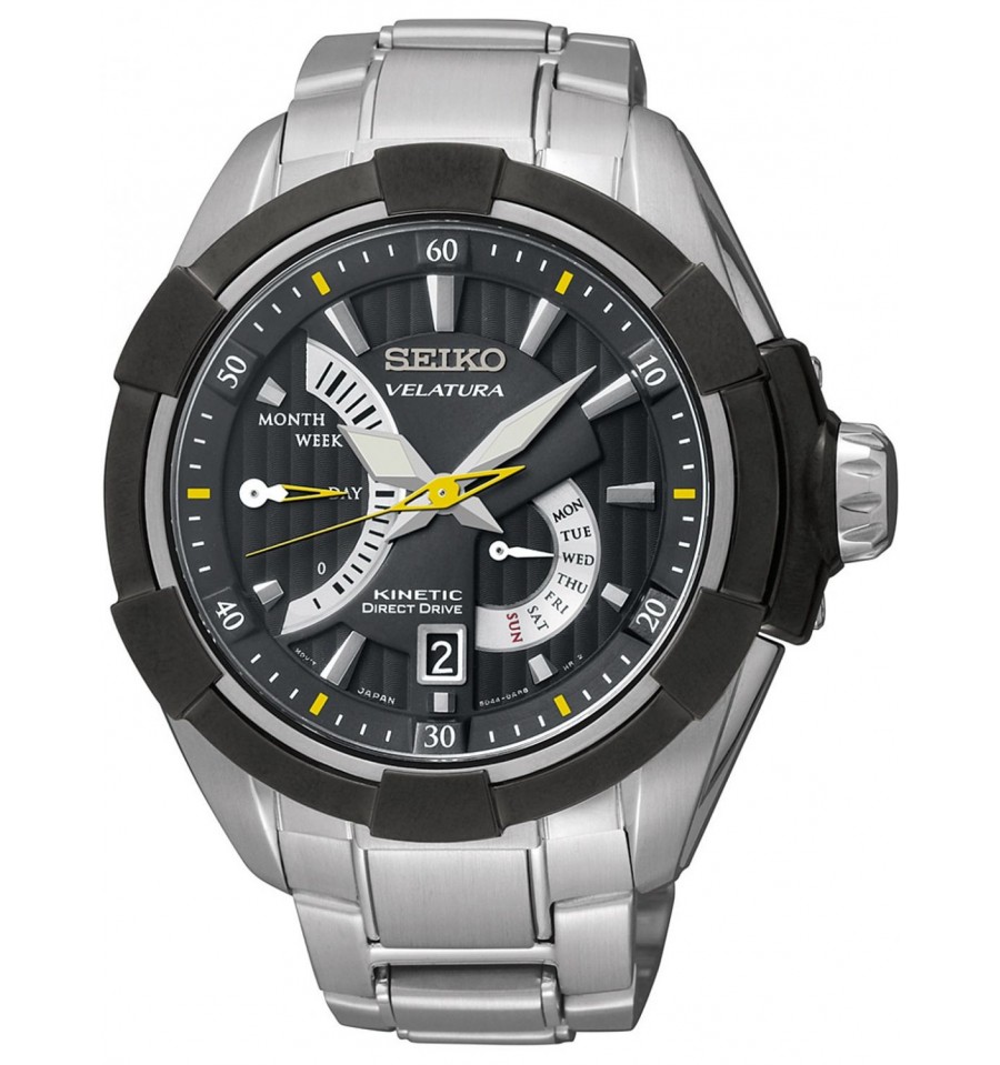 Acest ceas de mana barbatesc, Velatura Kintetic Direct Drive SRH015P1, produs de Seiko Watches, are carcasa din otel inoxidabil cu invelis negru, bratara din otel inoxidabil argintiu, cadranul in nuante inchise, geamul anti-reflexiv din cristal safir, iar sistemul de inchidere este de tip deployant. Mecanismul este kintetic.