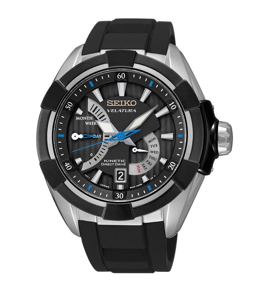 Acest ceas de mana barbatesc, Velatura SRH019P1, produs de Seiko Watches, are carcasa din otel inoxidabil cu invelis negru, bratara din cauciuc negru, cadranul in nuante inchise, geamul anti-reflexiv din cristal safir, iar sistemul de inchidere este prin catarama.