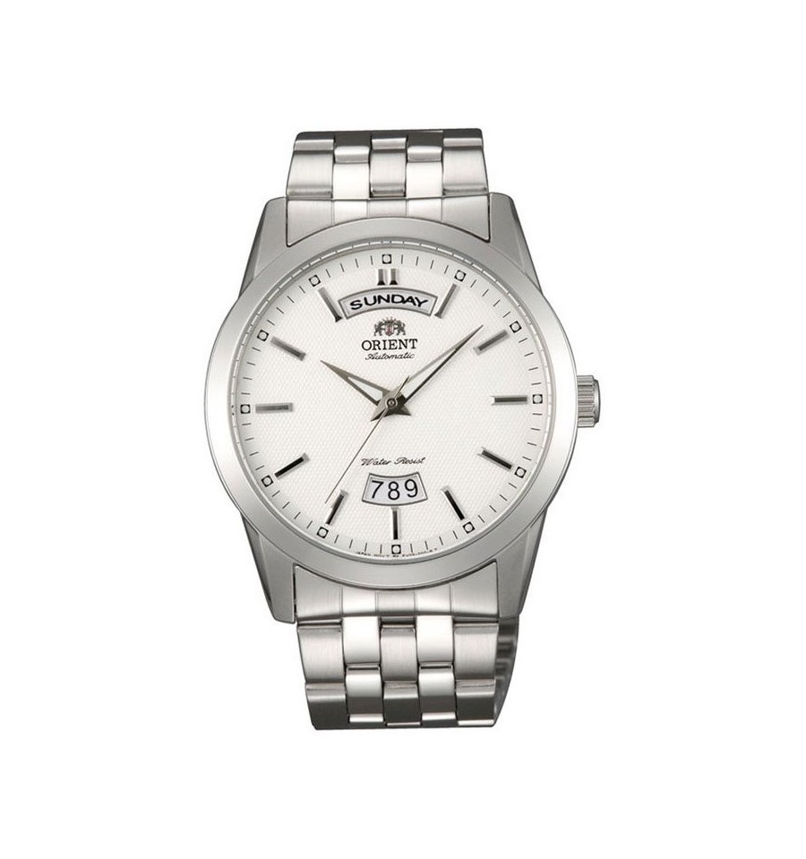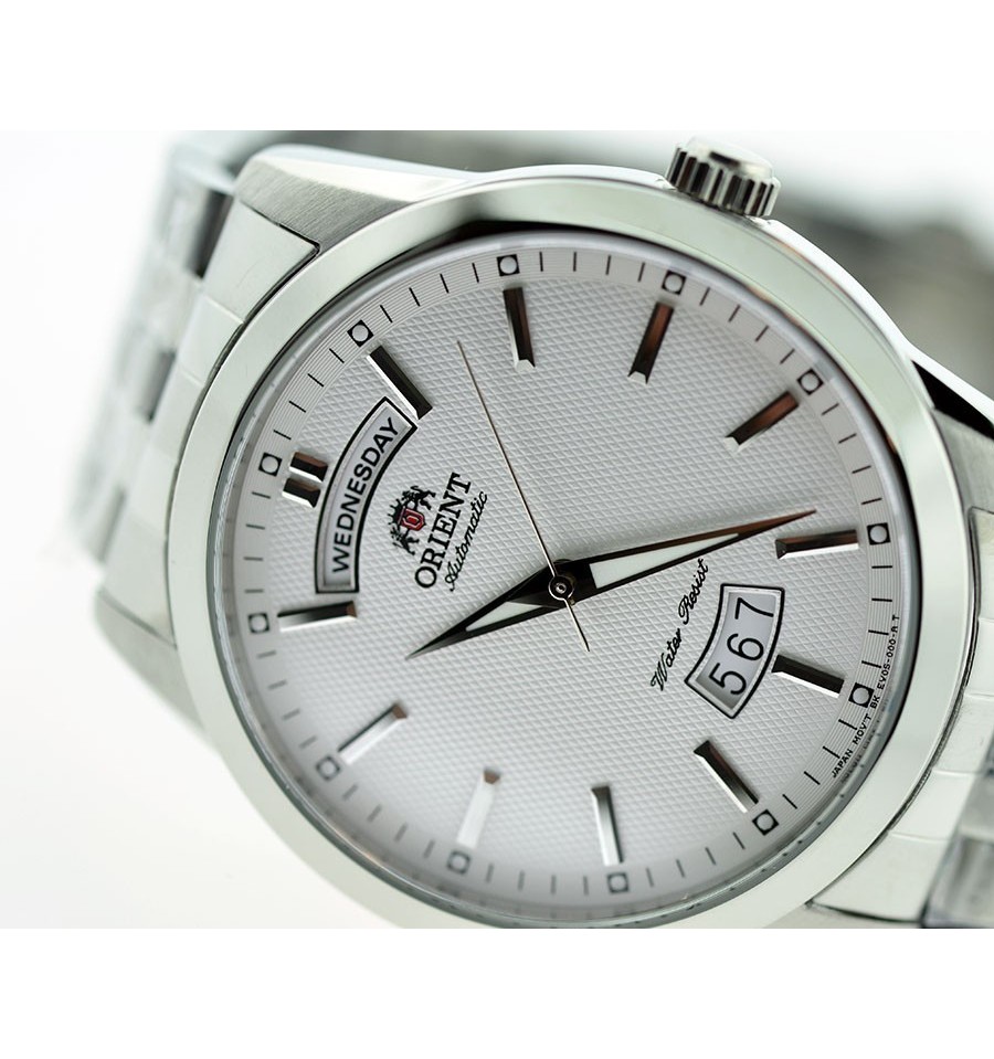 Ceasul de mana barbatesc Orient model FEV0S003WH este un ceas clasic cu indicatoare fosforescente.Vine cu un mecanis automatic 46E40 data,zi,geam mineral cristal rezistent la zgarieturi si se poate intra in apa cu ceasul avand 50m rezistenta la apa.Este un ceas zdravan barbatesc cu o dimensiune de 40mm.Vine cu garnatie de doi ani, factura si chitanta, cutie originala si toate actele.