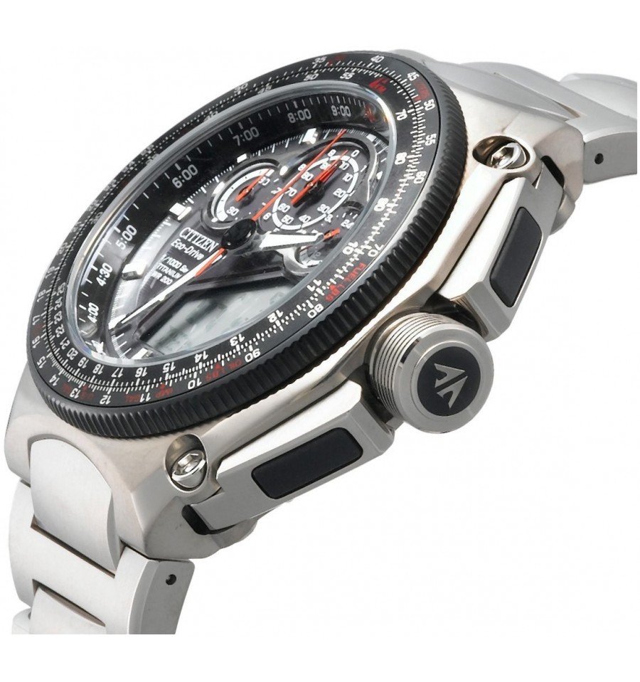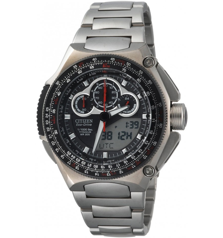 Acest ceas de mana barbatesc, Promaster SST (Skyhawk) JW0030-55E, produs de renumitul producator japonez Citizen, arata ora din 43 de orase, are cronograf care masoara pana la 24 h, in unitati de masura 1/1000 secunde, calculator viteza, cronometru. Are carcasa si bratara din titan, un material foarte usor si zezistent, placat ionic, cadranul negru, iar sistemul de inchidere este de tip fluture. Geamul este din cristal mineral rezistent la zgarieturi si antireflexiv. Ceasul converteste orice sursa de lumina fie naturala, fie artificiala, in energie utilizabila prin tehnologia Eco-Drive.