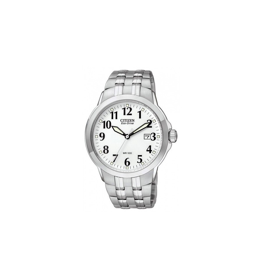 Acest ceas de mana barbatesc Sport WR 100 BM7090-51A, produs de renumitul producator japonez Citizen are carcasa si bratara din otel inoxidabil lustruit alb, cadranul alb, iar sistemul de inchidere este de tip fluture. Geamul este din cristal mineral. Ceasul converteste orice sursa de lumina fie naturala, fie artificiala, in energie utilizabila prin tehnologia Eco-Drive.