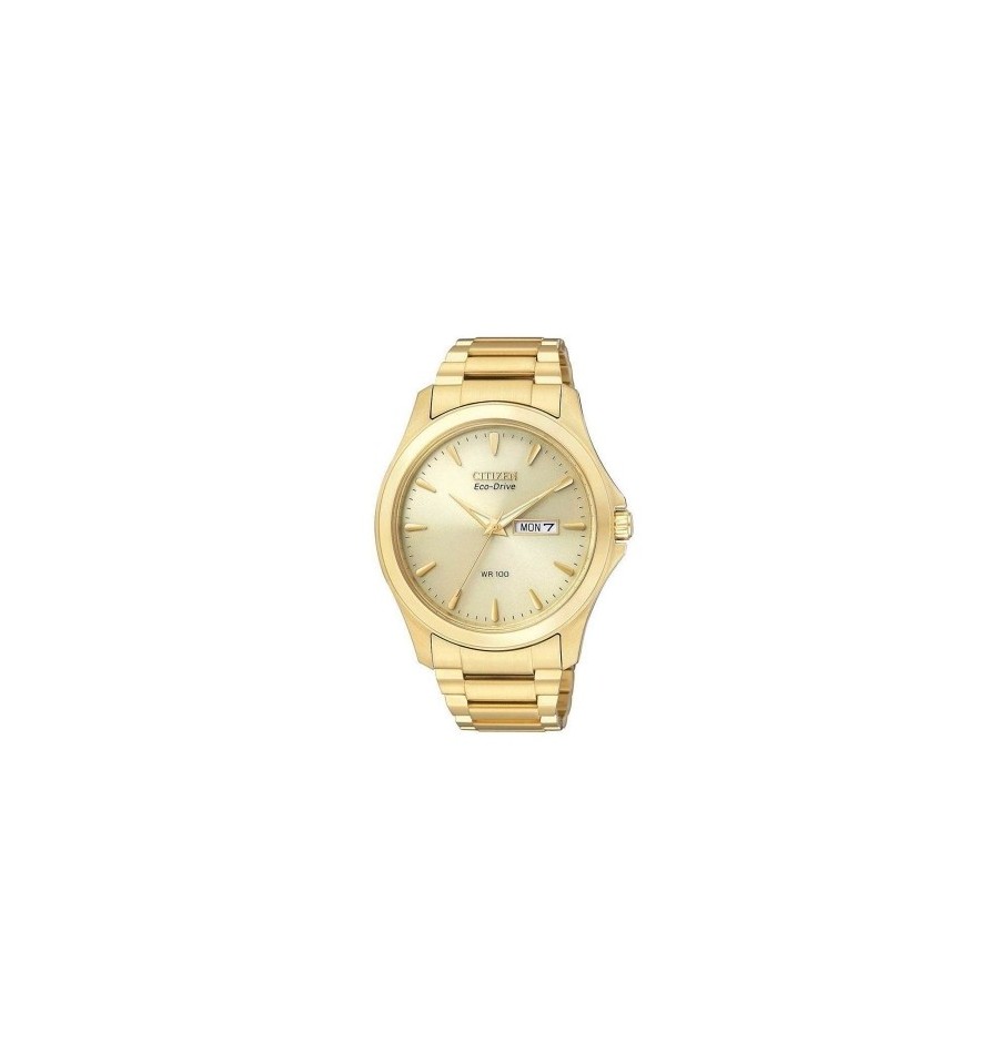 Acest ceas de mana barbatesc, Eco-Drive WR 100 BM8482-55P, produs de renumitul producator japonez Citizen, are carcasa si bratara din otel inoxidabil auriu, cardranul auriu, iar sistemul de inchidere este de tip fluture. Geamul este din cristal mineral. Ceasul converteste orice sursa de lumina fie naturala, fie artificiala, in energie utilizabila prin tehnologia Eco-Drive.