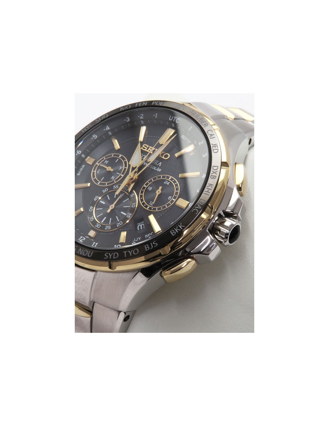 Ceas de mana barbatesc Seiko Coutura Radio Sync Solar Atomic Perpetuu Dual Time SSG019 este un ceas de 44,5mm cu mecanism japonez solar 8B63, calendar perpetuu si geam safir cristal.