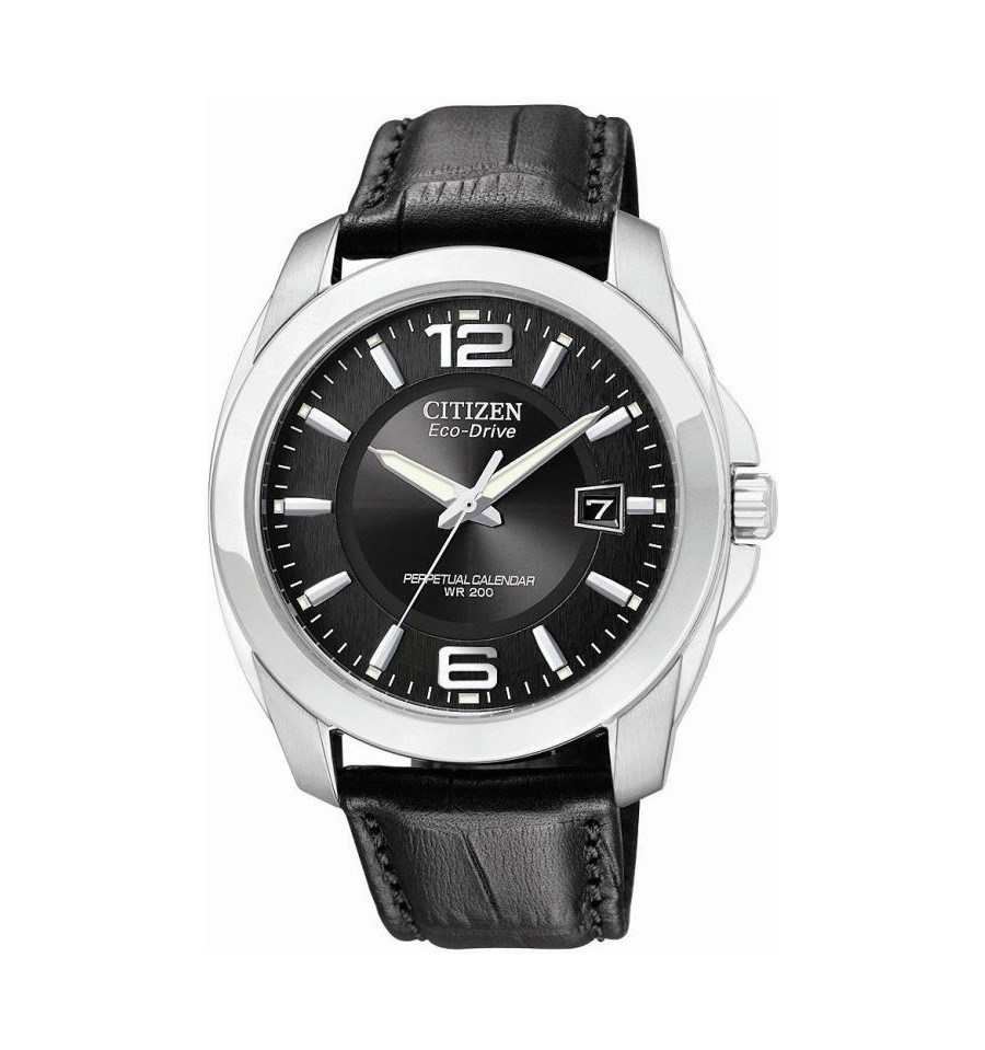Acest ceas de mana barbatesc, Perpetual Calendar BL1221-02E, produs de renumitul producator japonez Citizen, are carcasa din otel inoxidabil alb, cadranul negru, curea din piele naturala de culoare neagra, inchisa prin catarama. Geamul este din cristal mineral rezistent la zgarieturi. Ceasul converteste orice sursa de lumina fie naturala, fie artificiala, in energie utilizabila prin tehnologia Eco-Drive.