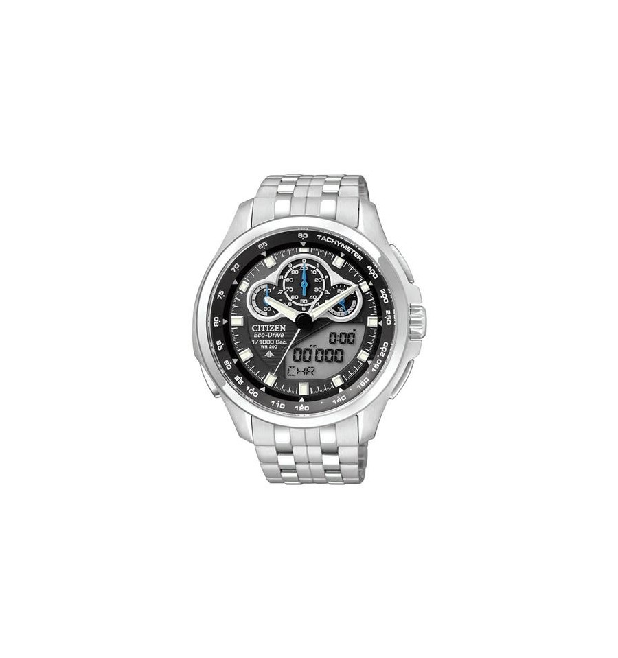 Acest ceas de mana barbatesc, Promaster SST JW0090-53E, produs de renumitul producator japonez Citizen, arata ora din 43 de orase, are cronograf care masoara pana la 24 h in unitati 1/1000 secunde, calculator viteza, cronometru. Are carcasa si bratara din otel inoxidabil in nuante argintii, cadranul negru, iar sistemul de inchidere este de tip deployant. Geamul este din cristal mineral rezistent la zgarieturi si antireflexiv. Ceasul converteste orice sursa de lumina fie naturala, fie artificiala, in energie utilizabila prin tehnologia Eco-Drive.