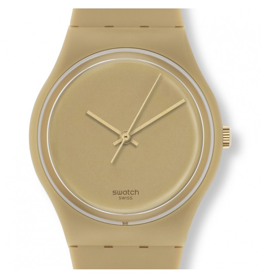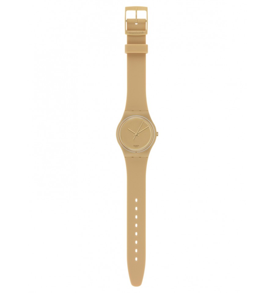 Ceasul acesta de mana unisex este produs de catre vestita firma elvetiana Swatch. Face parte din seria Gent. Bratara, cadranul si carcasa sunt din plastic de culoare bej. Cadranul este rotund cu limbi de culoare bej. Rezista la apa. Este modern si atragator.