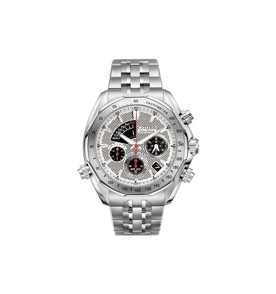 Acest ceas de mana barbatesc, Grand Complication BZ0000-50A, produs de renumitul producator japonez Citizen, are carcasa si bratra din otel inoxidabil in nuante argintii, cadranul alb, iar sistemul de inchidere este de tip fluture. Geamul este din safir antireflexiv si tratat anti-orbire. Ceasul este dotat cu cronograf, tahimetru, calendar perpetuu si triplu calendar. Ceasul converteste orice sursa de lumina fie naturala, fie artificiala, in energie utilizabila prin tehnologia Eco-Drive.