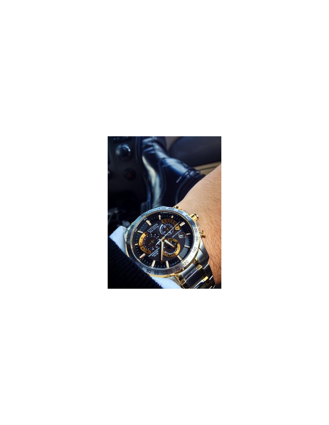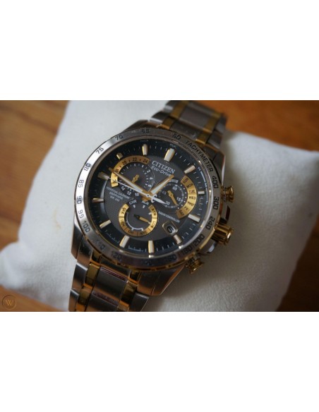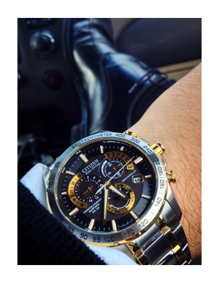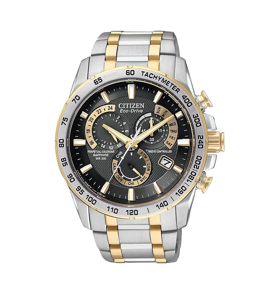 Acest ceas de mana barbatesc, Perpetual Chrono A-T AT4004-52E, produs de renumitul producator Citizen, are carcasa si bratara din otel inoxidabil in doua nuante, cadranul negru, iar geamul este din safir antireflexiv. Ceasul este dotat cu tahimetru, functie cronograf, alarma si are precizie atomica cu acuratete radio controlata din 5 fuse orare. Ceasul converteste orice sursa de lumina fie naturala, fie artificiala, in energie utilizabila prin tehnologia Eco-Drive si are functie de avertizare de energie redusa.
