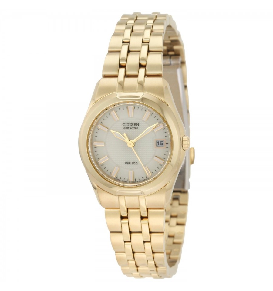 Acest ceas de mana de dama, Corso EW0942-56P, produs de renumitul producator Citizen, are carcasa si bratara din otel inoxidabil auriu, cadranul de culoarea sampaniei, iar geamul din cristal mineral. Ceasul converteste orice sursa de lumina fie naturala, fie artificiala, in energie utilizabila prin tehnologia Eco-Drive.