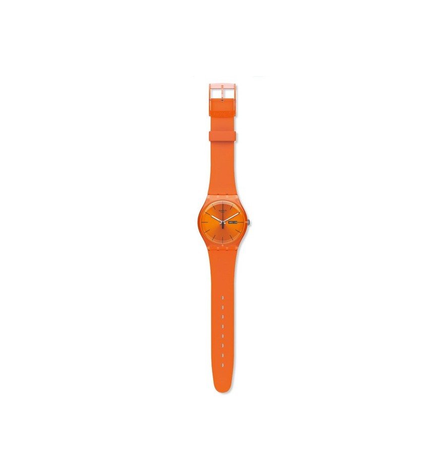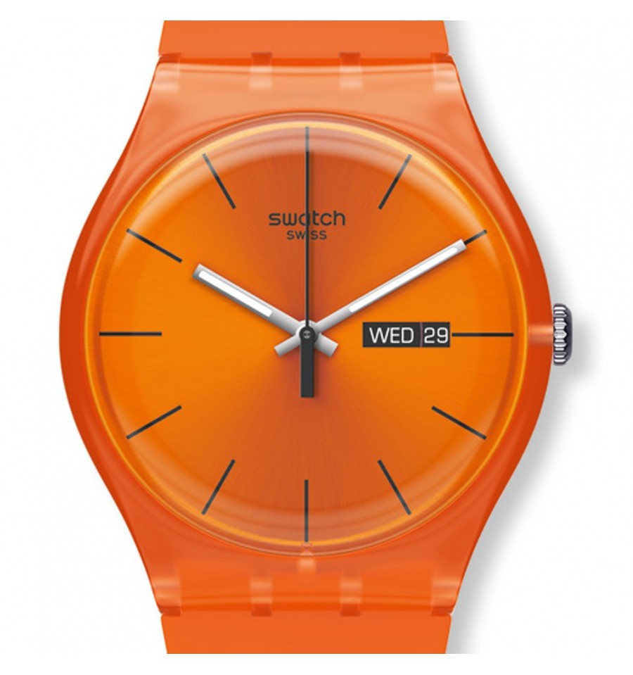 Acesta este un ceas de mana unisex fabricat de catre renumita firma elvetiana Swatch. Face parte din categoria New Gent. Carcasa este din plastic portocaliu. Bratara este din silicon portocaliu. Cadranul tot portocaliu este rotund. Limbile sunt argintii si fosforescente. Afiseaza ziua si data. Rezista la apa. Este elegant si sobru.