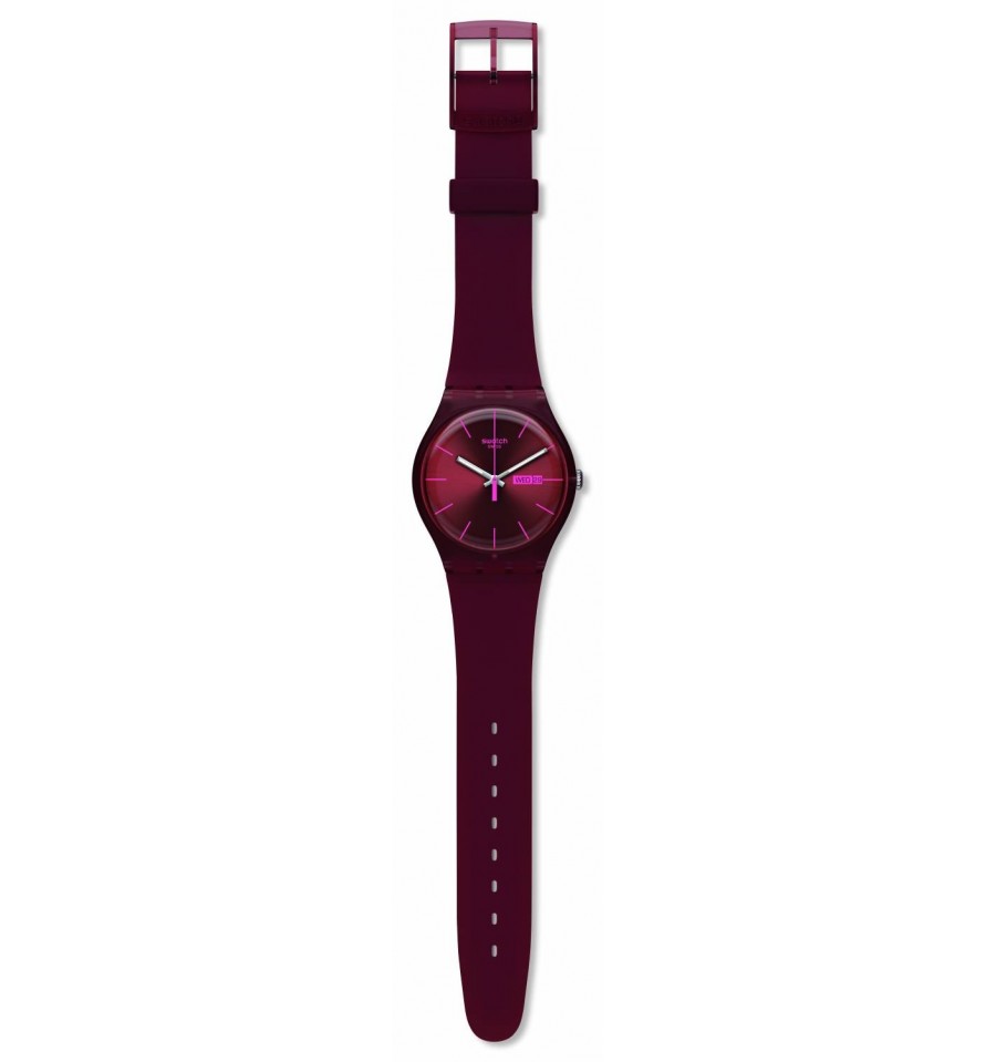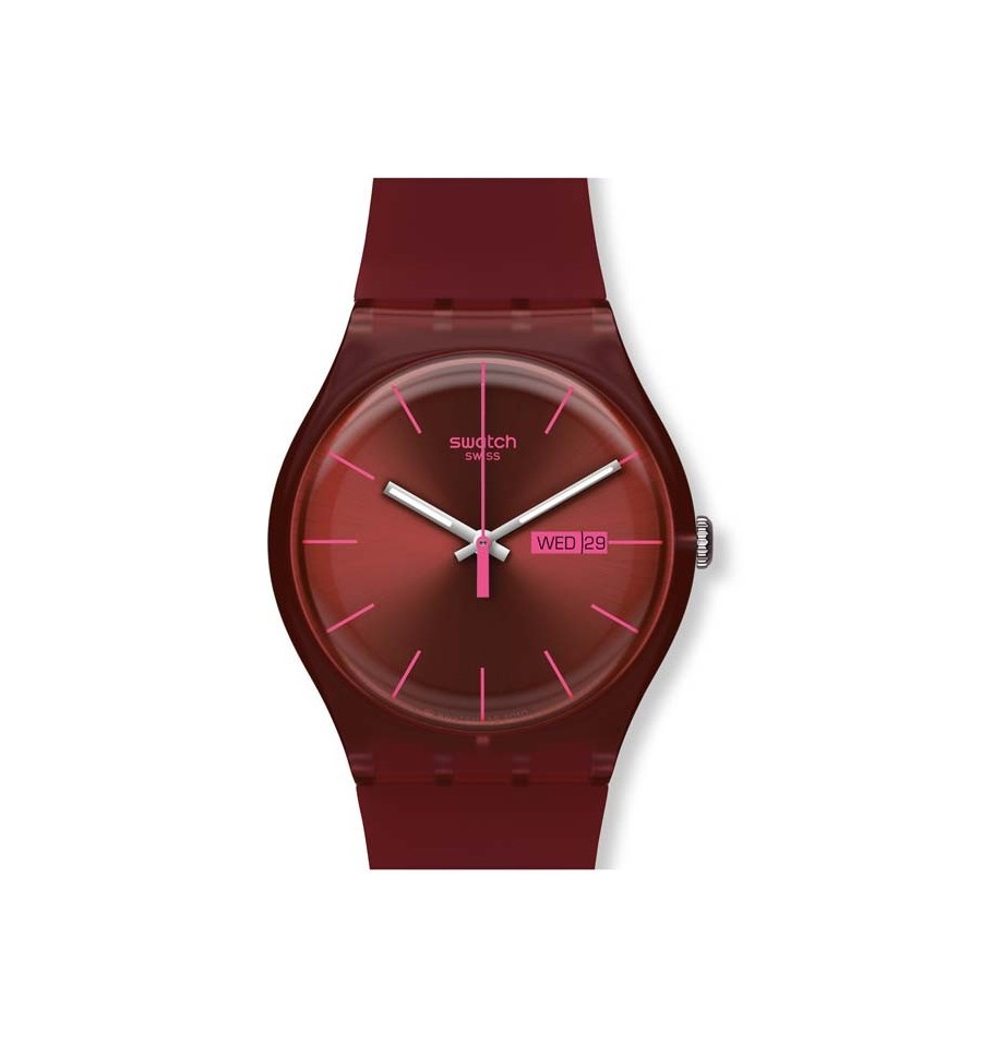 Acesta este un ceas barbatesc fabricat de catre vestita firma elvetiana Swatch. Face parte din seria New Gent. Carcasa este din plastic rosu inchis. Bratara este din silicon rosu inchis. Cadranul rosu inchis este rotund. Afiseaza ziua si data. Rezista la apa. Este un ceas placut si modern.